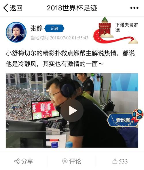 央视记者张静在评论席拍摄了洪钢老师在小舒梅切尔扑出莫德里奇点球时的反应,原来洪帮主也有激情一面。