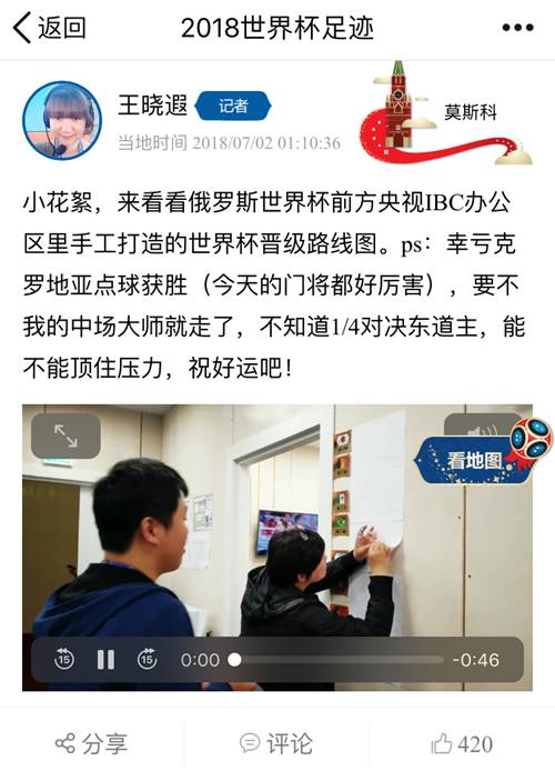 央视记者王晓遐用一条视频记录下俄罗斯世界杯前方央视IBC办公区内,工作人员手工打造的世界杯晋级路线图。