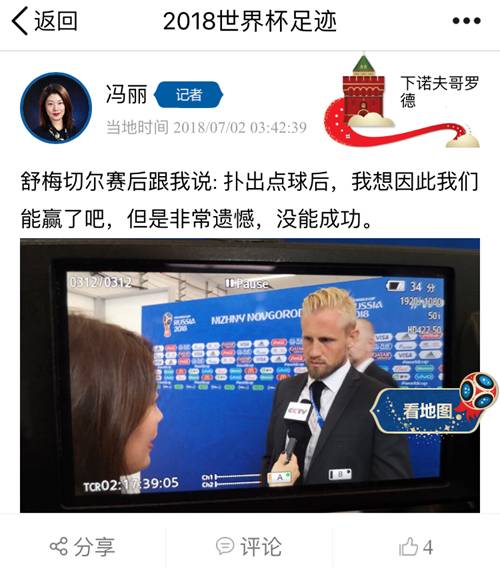 央视记者冯丽:“舒梅切尔赛后跟我说: 扑出点球后,我想因此我们能赢了吧,但是非常遗憾,没能成功。”