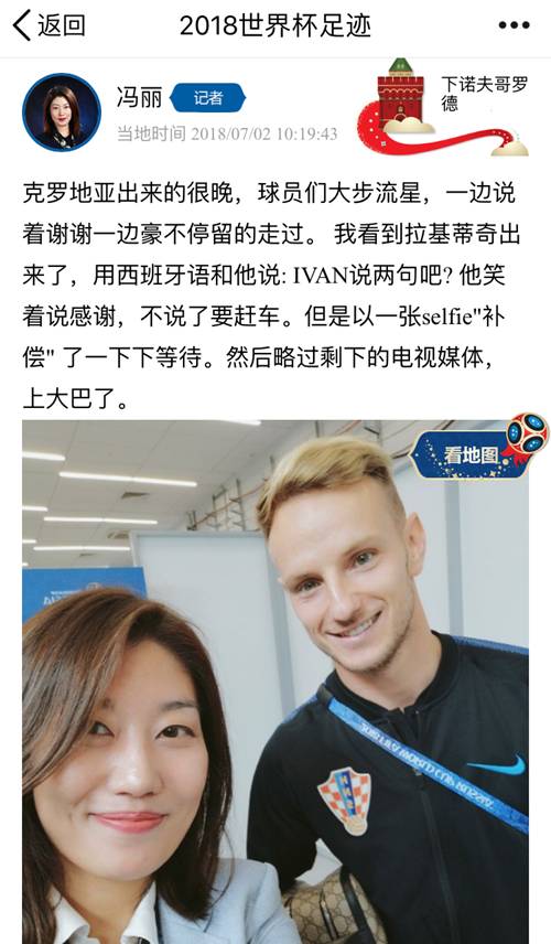央视记者冯丽:“克罗地亚出来的很晚,球员们大步流星,一边说着谢谢一边豪不停留的走过。 我看到拉基蒂奇出来了,用西班牙语和他说: IVAN说两句吧? 他笑着说感谢,不说了要赶车。但是以一张selfie"补偿" 了一下下等待。然后略过剩下的电视媒体,上大巴了。”