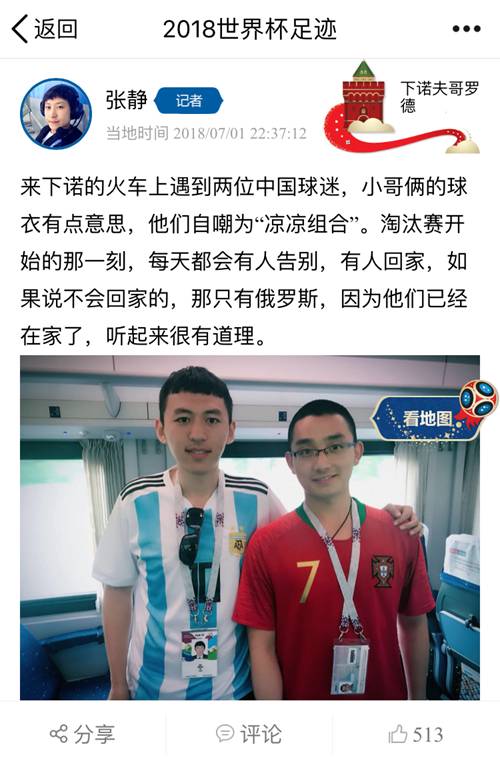 央视记者张静:“来下诺的火车上遇到两位中国球迷,小哥俩的球衣有点意思,他们自嘲为“凉凉组合”。淘汰赛开始的那一刻,每天都会有人告别,有人回家,如果说不会回家的,那只有俄罗斯,因为他们已经在家了,听起来很有道理。”