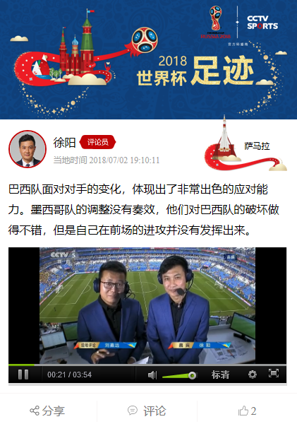 巴墨之战由中央电视台评论员刘嘉远与解说嘉宾徐阳搭档评述。比赛中,他们称赞巴西队前场进攻“妙腿生花”,“踢出了桑巴的味道”。赛后,在提到萨马拉这座城市以及这里上演的这场精彩比赛时,徐阳不忘调侃:“嘉远,拉达汽车我坐过,图-154飞机我坐过,这场比赛我也见证了。”