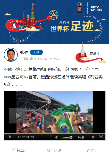 另外,记者张强发现,由于巴西队和阿根廷队是南美宿敌,所以巴西球迷在比赛前把墨西哥队放在一边,更热衷“狠怼”已经出局的阿根廷队,在场外高唱歌曲《梅西再见》。