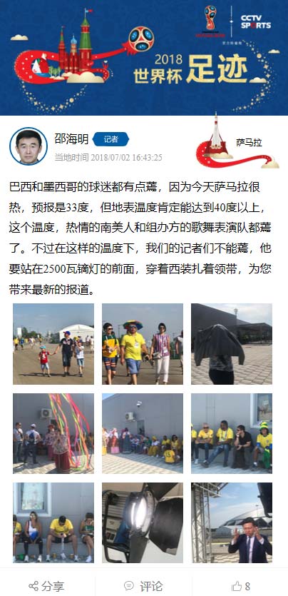 巴西队与墨西哥队的比赛在萨马拉进行,当天气温摄氏33度,地表温度接近40度。记者邵海明感慨:“他要站在2500瓦镝灯的前面,穿着西装扎着领带,为您带来最新的报道。”在如此的高温下工作,记者们不能有丝毫大意。