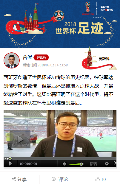 本届世界杯,以传控打法为主导的西班牙队和德国队早早出局。巴西队的出色表现以及对场面的控制,给出局的西班牙队和德国队做出了示范。而随后比利时队与日本队的比赛,展现了速度与变化的魅力,更让人热血沸腾。上半场堪称比利时队的攻坚战,本场评论员朱晓雨用生动的语言形容了场上的局势:“日本队后卫一前一后像跳交谊舞一样把卢卡库夹在中间”,“卢卡库连摆腿的空间都没有,他找到了挤早高峰地铁的感觉”,“比利时队现在面临的是一场攻城之战,对方城门紧闭,就看比利时队的云梯什么时候能架到日本队的城头上”,“比利时既然选择在正面进行强攻,不如发挥一下‘弓箭手’的威力”。