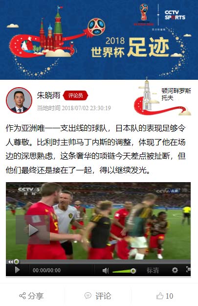 值得一提的是,两球领先的日本队并没有一味防守,而是不停寻找扩大比分的机会,直到最后一刻。虽然遗憾出局,日本队足以赢得掌声。赛后,朱晓雨称赞“亚洲独苗”日本队的出色表现。同时,他也称赞了比利时队主帅马丁内斯的妙手换人。比利时队成为世界杯48年来首支两球落后最终三球逆转取胜的球队。