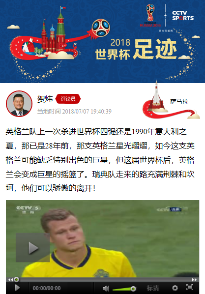 英格兰队与瑞典队的比赛由评论员贺炜和解说嘉宾杨晨搭档评述。英格兰队取得了一场令人信服的胜利,但如果不是斯特林玩“快乐足球”,屡次单刀不进,比赛悬念在上半场就将终结。贺炜没有放过斯特林,在下半场瑞典队的一次解围后,贺炜调侃道:“如果他知道后面是斯特林的话,放过去也没关系。”“斯特林听到以后肯定想对我翻个白眼了。”