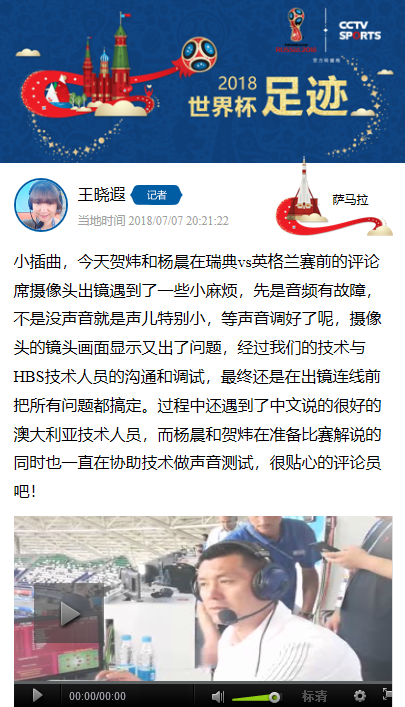 央视网前方记者王晓遐在“世界杯足迹”平台透露了解说中的小插曲,原来本场比赛转播前出现了一些技术性小问题,但很快得到解决,没有影响到转播。