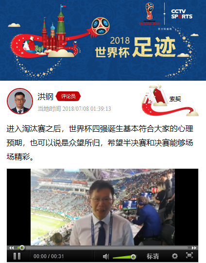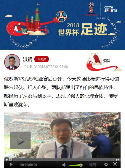 赛后,洪钢在“世界杯足迹”平台中写道:“今天这场比赛进行得可谓跌宕起伏、扣人心弦,两队都踢出了各自的民族特性,都经历了从落后到扳平,表现了强大的心理素质,俄罗斯队虽败犹荣。”