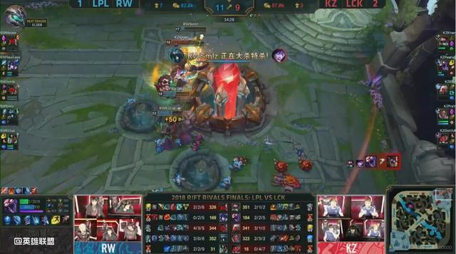 28分钟,RW打野猪妹大龙处强行开团,配合克烈击杀卢锡安。KZ依靠蒙多反制掉猪妹,RW打出1换2 。但离KZ后期优势的时间越来越近。33分钟,RW在小龙选择背水一战,DoinbTP抄后,直接砍翻了KZ后排,配合SMLZ的死歌。瞬间完成0换3!打赢团战的RW没有给KZ任何机会,从下路直上高地拼死拆掉了水晶,将LPL从悬崖边拉了回来!