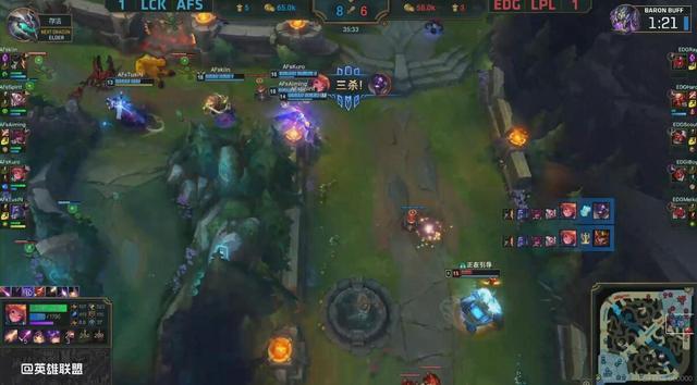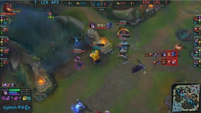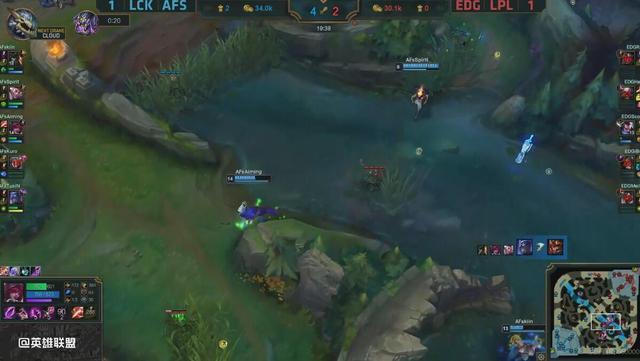 但EDG接连两波针对AFS的Gank失误,让上单船长的发育非常舒服,AFS开始将比赛带入自己的发育节奏。EDG在前期陷入被动。20分钟,双方在小龙处接团。AFS发育良好的霞接管比赛,AFS打出一波1换4。EDG再处劣势。