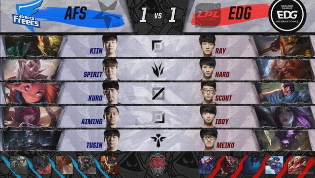 双方BP情况:EDG秒锁亚索,配合三手击飞,加上卡莎阵容十分激进。而AFS则选择了霞洛中野,佐伊则放在了下路,上路放出了船长。