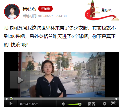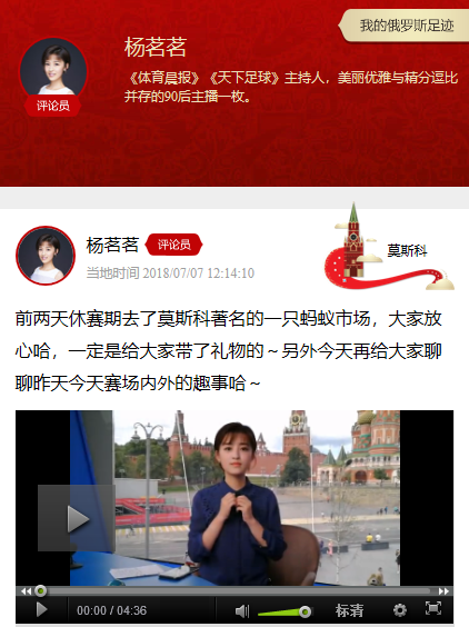 世界杯进入淘汰赛阶段后,忙碌的杨茗茗终于迎来了休息日。她走上莫斯科街头,来到著名的蚂蚁市场,给球迷朋友准备了礼物,并在直播中分享了她在俄罗斯的故事。听杨茗茗讲故事,讲比赛,永远都是快乐的。