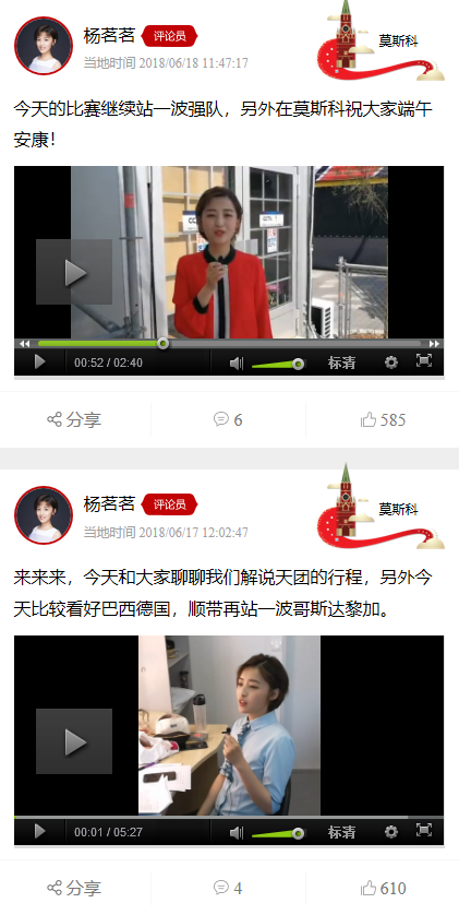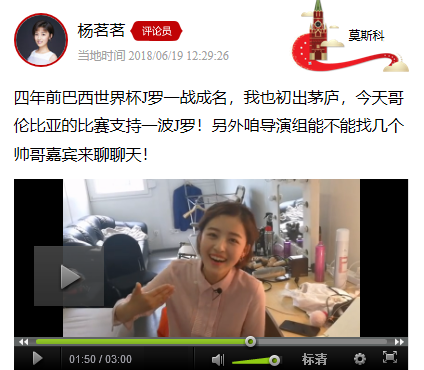 瓦西里大教堂前的红场演播室,是杨茗茗最近一个月的工作地点。在这里,她要参加室内的前方连线,还要外景出镜,同时要经营自己的节目《红场茗片》、《茗嘴随时播》、《茗茗想知道》。这些节目里杨茗茗用呆萌清新的语言,与球迷们一起分享她的世界杯见闻。看过杨茗茗直播的球迷都会大呼“被甜到”“被萌到”,粉丝们亲切地称呼她“大茗子”。看过她在世界杯期间侃球的球迷,还会称她一声“杨指导”。这位“杨指导”当然不是解说嘉宾、不是前国脚杨晨,而是这位清新自然的美女主持人。