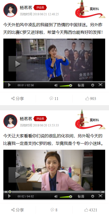 在“世界杯足迹”平台,我们看到镜头前的杨茗茗工作时潇洒干练,聊天时真实自然,我们看到的杨茗茗永远那么快乐,洋溢着甜美的笑容,让多少球迷瞬间沦陷。祝福杨茗茗永远快乐,也期待她带给我们更多欢乐!