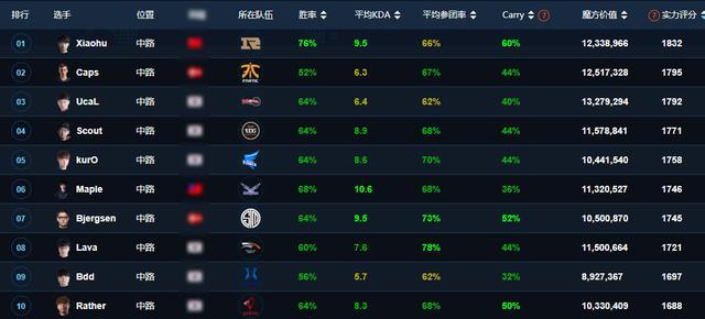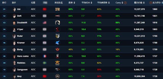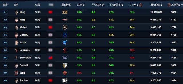 辅助也是RNG的小明第一,然后是mata,很有意思的是在下路的组合上,其实有就是RNG和KT瓜分了,而且他们都跟uzi有莫大的关联,EDG的meiko位列第三名。