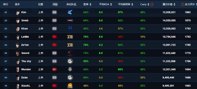 上单方面前三名都是LCK的选手,其中kiin排名第一,smeb和khan紧随其后,第四名和第五名是RNG的上单组合,letme和姿态,其实在个人选手的评分上letme和khan是一样的