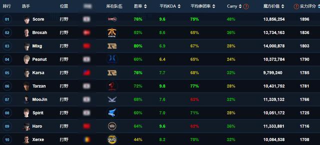 打野老队长score摘得桂冠,mlxg超越小花生成为了第三名,karsa紧随其后