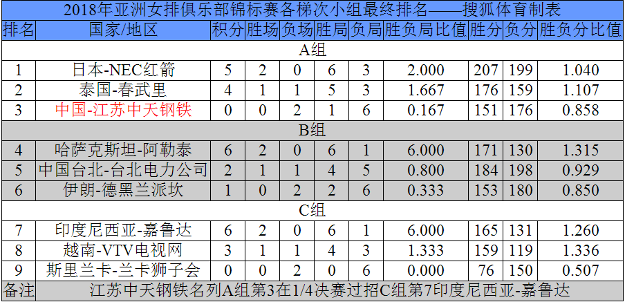 北京时间7月14日,2018年女排亚俱赛在厄斯克门结束小组单循环赛较量,A组张常宁和龚翔宇缺阵的江苏中天钢铁,虽然拦网和发球占据上风,但由于进攻处于劣势以1-3被日本-NEC红箭逆转,小组单循环排名敲定为日本、泰国、江苏、哈萨克斯坦、中国台北、伊朗、印度尼西亚、越南和斯里兰卡,1/4决赛对阵形势是第3江苏中天钢铁过招第7印度尼西亚。