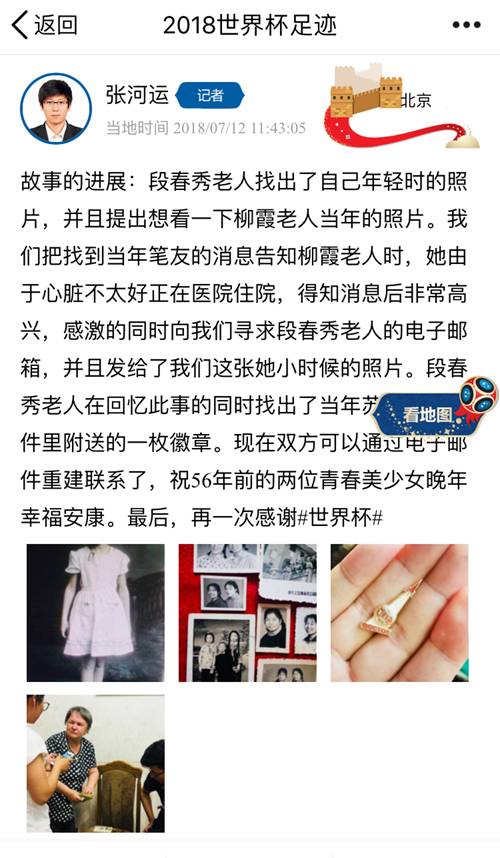 “故事的进展:段春秀老人找出了自己年轻时的照片,并且提出想看一下柳霞老人当年的照片。我们把找到当年笔友的消息告知柳霞老人时,她由于心脏不太好正在医院住院,得知消息后非常高兴,感激的同时向我们寻求段春秀老人的电子邮箱,并且发给了我们这张她小时候的照片。段春秀老人在回忆此事的同时找出了当年苏联来的信件里附送的一枚徽章。现在双方可以通过电子邮件重建联系了,祝56年前的两位青春美少女晚年幸福安康。最后,再一次感谢#世界杯#。”
