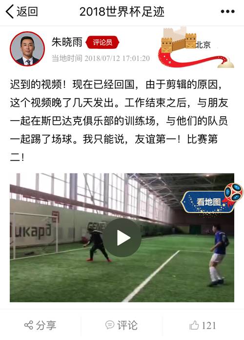 央视评论员朱晓雨回国之后上传了一条在俄罗斯与斯巴达克俱乐部的队员们踢了一场球,至于结果嘛,他说友谊第一比赛第二!