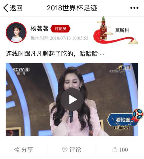央视评论员杨茗茗发布了几条视频,为大家介绍了朝夕相处的红场演播室,而在与马凡舒连线时聊到了在世界杯现场看球的感受,还用俄罗斯的巧克力味冰激凌馋了馋凡凡!