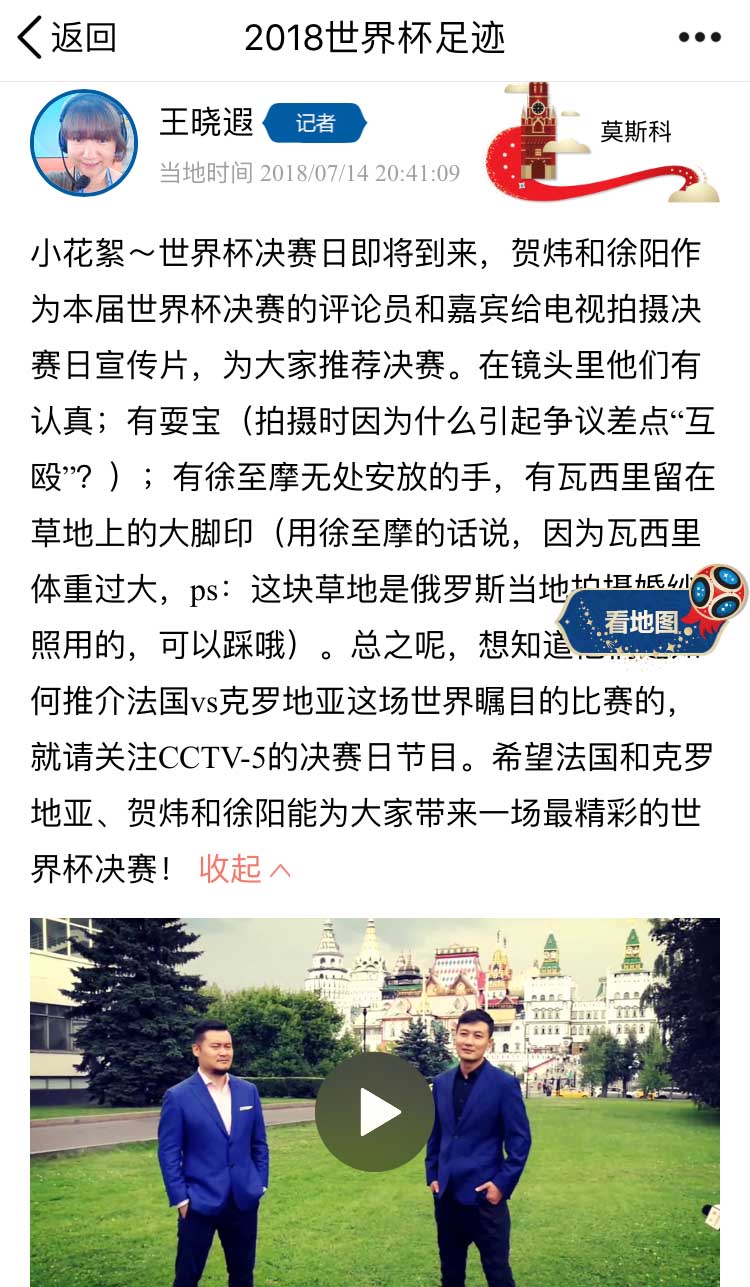 央视记者王晓遐发布了一则则,纪录了贺炜与徐阳在为世界杯决赛日拍宣传片时的花絮。瓦西里贺的大脚印从何而来?徐志摩的手为何无处安放?他们俩为何当众“互殴”?敬请期待今晚的世界杯决赛!
