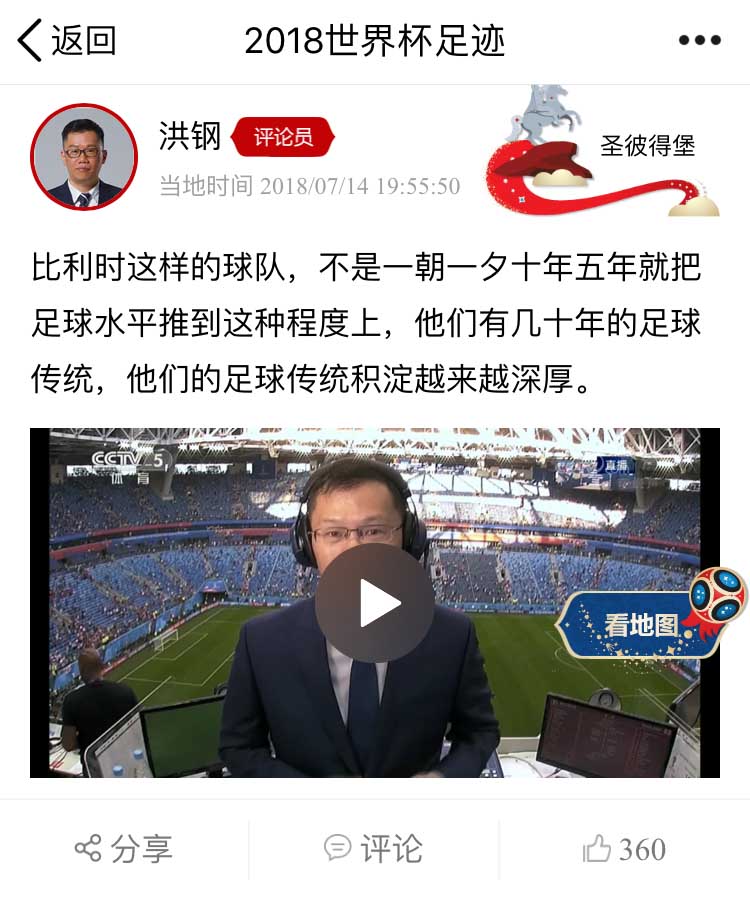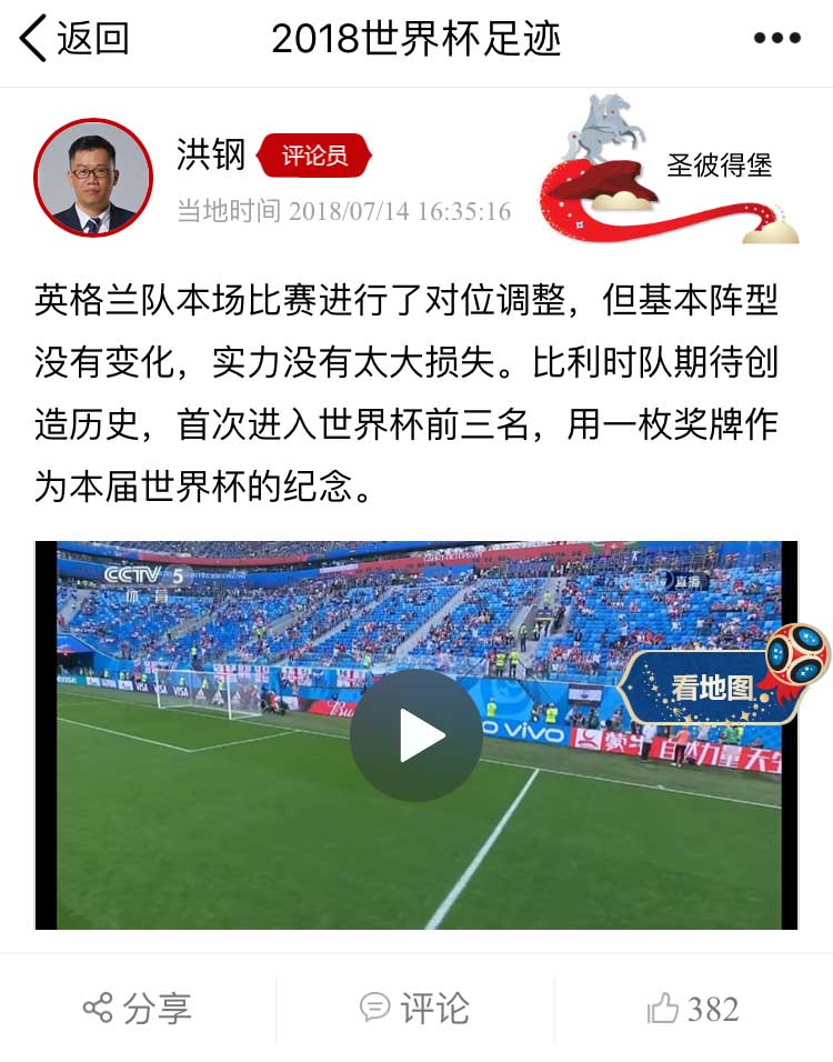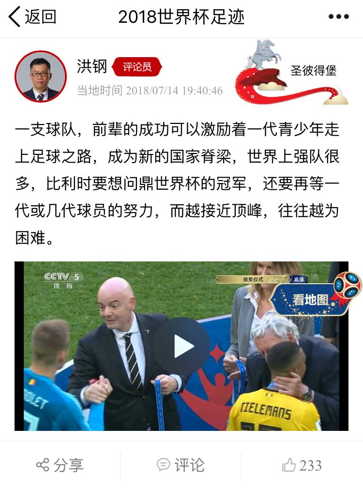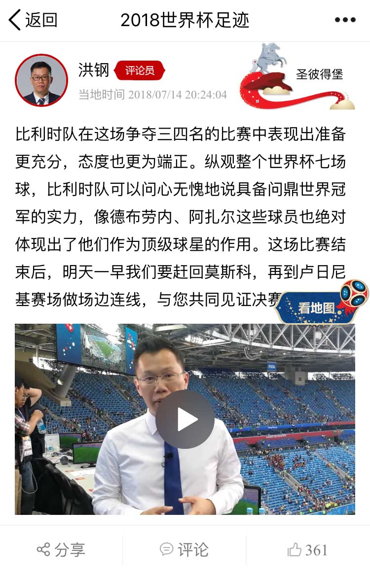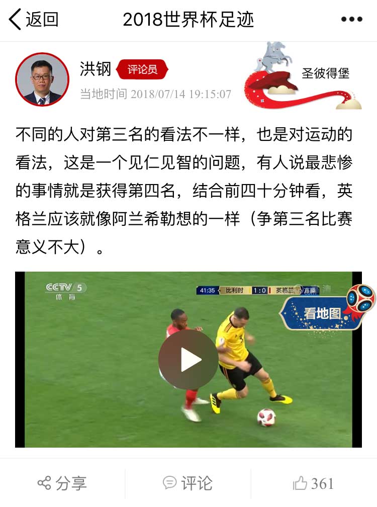 “比利时队在这场争夺三四名的比赛中表现出准备更充分,态度也更为端正。纵观整个世界杯七场球,比利时队可以问心无愧地说具备问鼎世界冠军的实力,像德布劳内、阿扎尔这些球员也绝对体现出了他们作为顶级球星的作用。这场比赛结束后,明天一早我们要赶回莫斯科,再到卢日尼基赛场做场边连线,与您共同见证决赛日。”