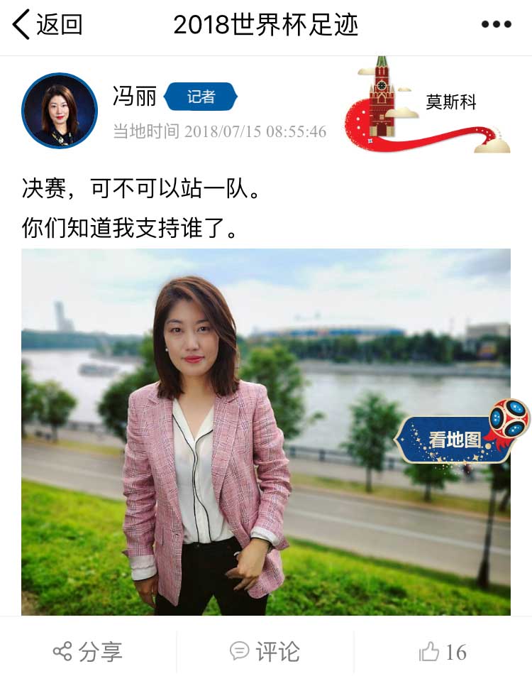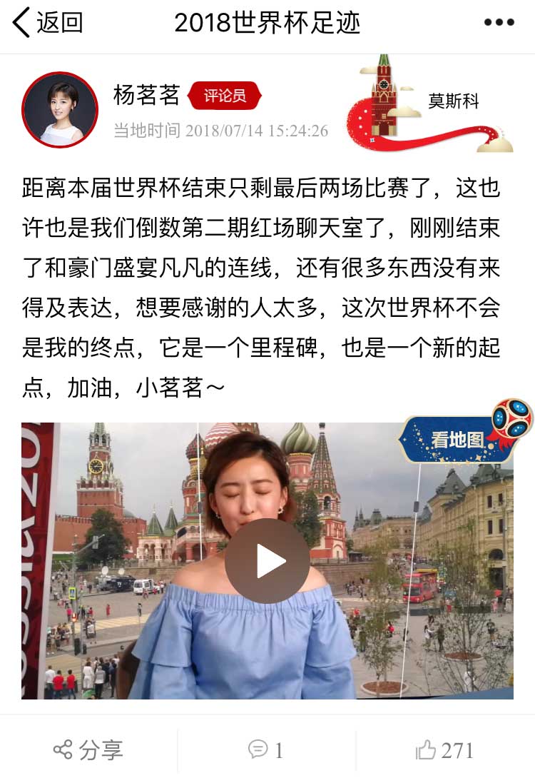 央视评论员杨茗茗:“距离本届世界杯结束只剩最后两场比赛了,这也许也是我们倒数第二期红场聊天室了,刚刚结束了和豪门盛宴凡凡的连线,还有很多东西没有来得及表达,想要感谢的人太多,这次世界杯不会是我的终点,它是一个里程碑,也是一个新的起点,加油,小茗茗~”