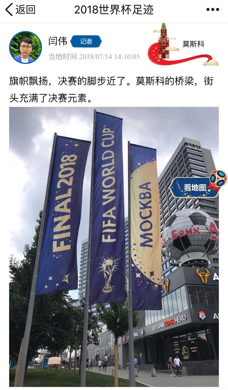 央视记者闫伟:“旗帜飘扬,决赛的脚步近了。莫斯科的桥梁,街头充满了决赛元素。”
