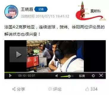 当法国队锁定胜局,比赛变得悬念不大时,贺炜和徐阳干脆说起了“相声”。