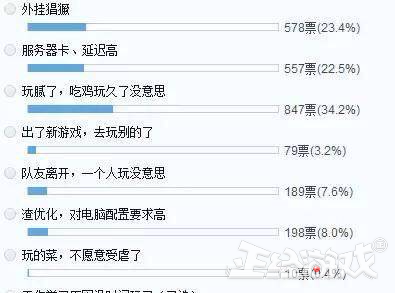 在玩家大量流失的四、五月份,有平台上发起了离开游戏的原因投票,“吃鸡玩久了,腻了”是玩家离开游戏的首选项。这对一款现象级的游戏来说是这点还是蛮尴尬的。