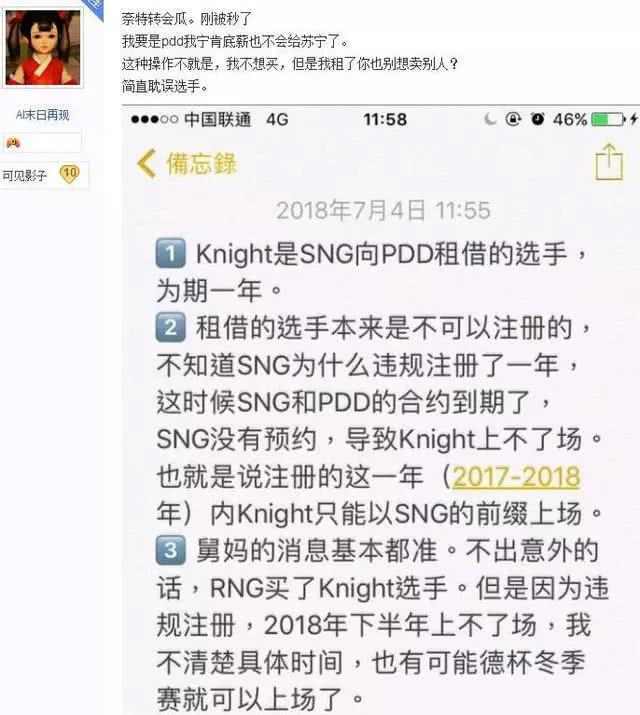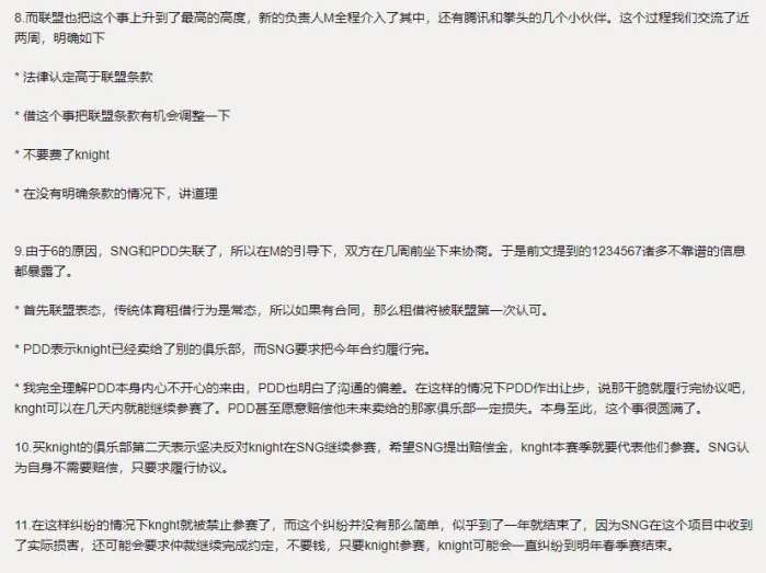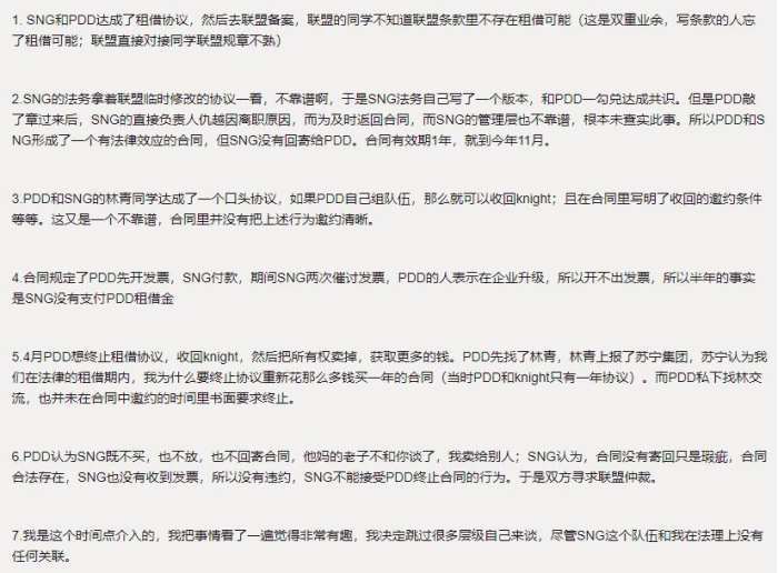 然而,这件事依然没有结束,在今天凌晨,一直活跃于虎扑论坛的一个圈内人,——龙珠创始人发了一条非常长的帖子,详细地介绍了knight事件。从他的描述中我们可以看到,其实knight是由PDD租借给SNG战队,但是在租借过程中,由于双方发生了比较大的误会,使得原本属于合作关系的双方,矛盾迅速激化,甚至一度闹到了联盟寻求仲裁,此时的龙珠创始人才正式知晓这件事。