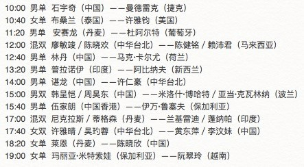 中国队方面,明天上午10点本次赛会3号种子江苏籍的石宇奇将在男单预赛中对阵来自捷克的曼德雷克。作为本次大赛的9号种子,林丹将在下午1点前后登场,迎战来自荷兰的马克。本次赛会头号种子丹麦选手安赛龙预计将在11:20左右登场,迎战葡萄牙的杜阿尔特。