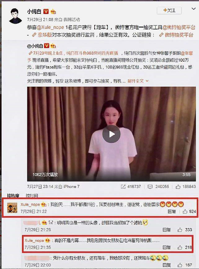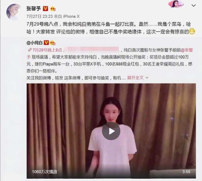 当然对于普通观众来说,这些主播人气再高跟自己的关系也不大,他的粉丝哪怕有几百几千万又不能给自己分一毛钱,自己就算要去看也是冲着他的直播质量。但是这次纯白不仅带来了一如既往的高质量直播,还带来了超级丰厚的“真金白银”。在首播开始前,纯白就在微博发起了一次隆重的抽奖,这次抽奖的重头戏是一辆捷豹F-Type跑车,还有数量不等的IphoneX手机和现金红包以及王者荣耀周边等奖品,奖品的总额远超100万。这样大手笔的抽奖可以说是历史罕见的。