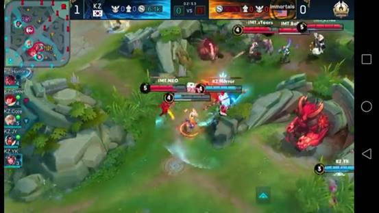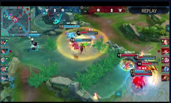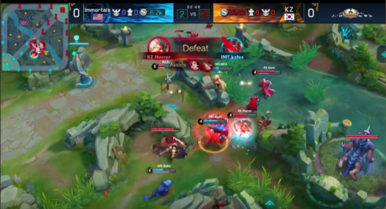 5分39秒,KZ又拿下暴君。6分34秒IMT强行进攻KZ下路一塔击杀KZ的白起和鬼谷子,再次取得微弱领先。随后KZ裴擒虎在草丛蹲到并击杀IMT马可波罗,人头虽以3:5落后,但经济又反超。