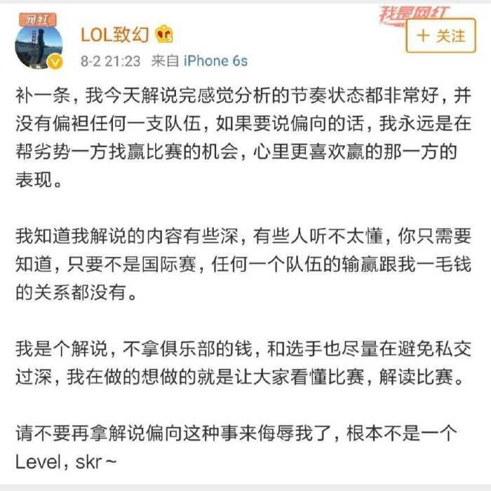 看过这么多场LPL的比赛,这种节奏总是会时不时的出现,作为专业解说,有事没事还得回复一下这种节奏,其实大家要是把目光都放在比赛上面,就觉得这其实也没什么了,能为自己支持的队伍加油,还是一件很幸福的事。还是把注意力集中在比赛当中去才是正确的,解说的存在只是为了更好地释放游戏带来的魅力,让比赛在解说中得到升华,而不是矛盾的发源地!