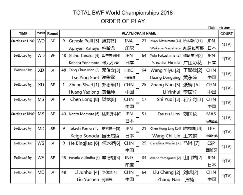 北京时间8月4日,2018世界羽毛球锦标赛将在中国南京青奥体育公园体育馆展开全部五个单项半决赛的争夺。其中的焦点战无疑是男单谌龙与石宇奇的中国德比,以及女单何冰娇挑战里约奥运会冠军马琳一战。半决赛日赛程表如下: