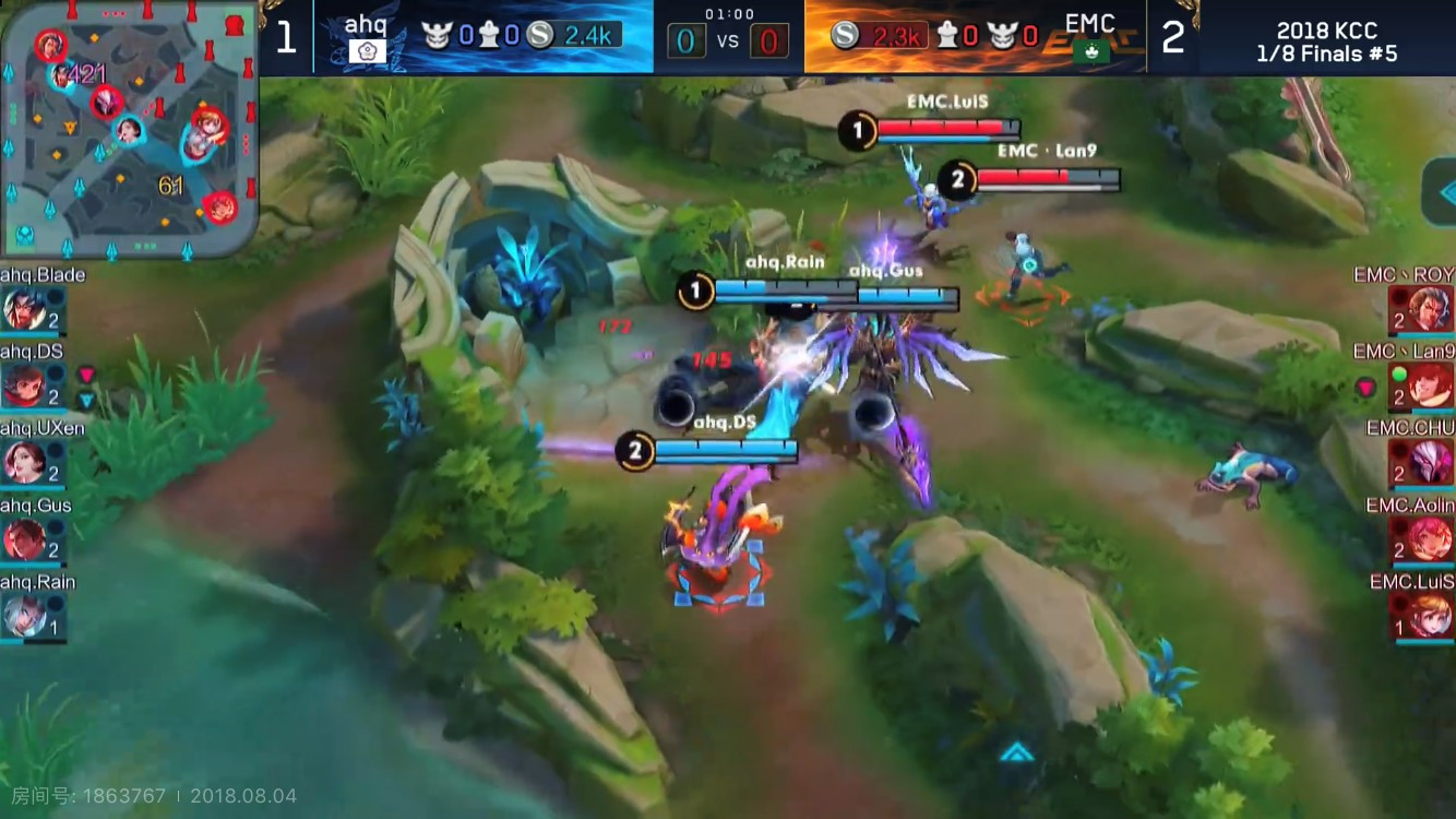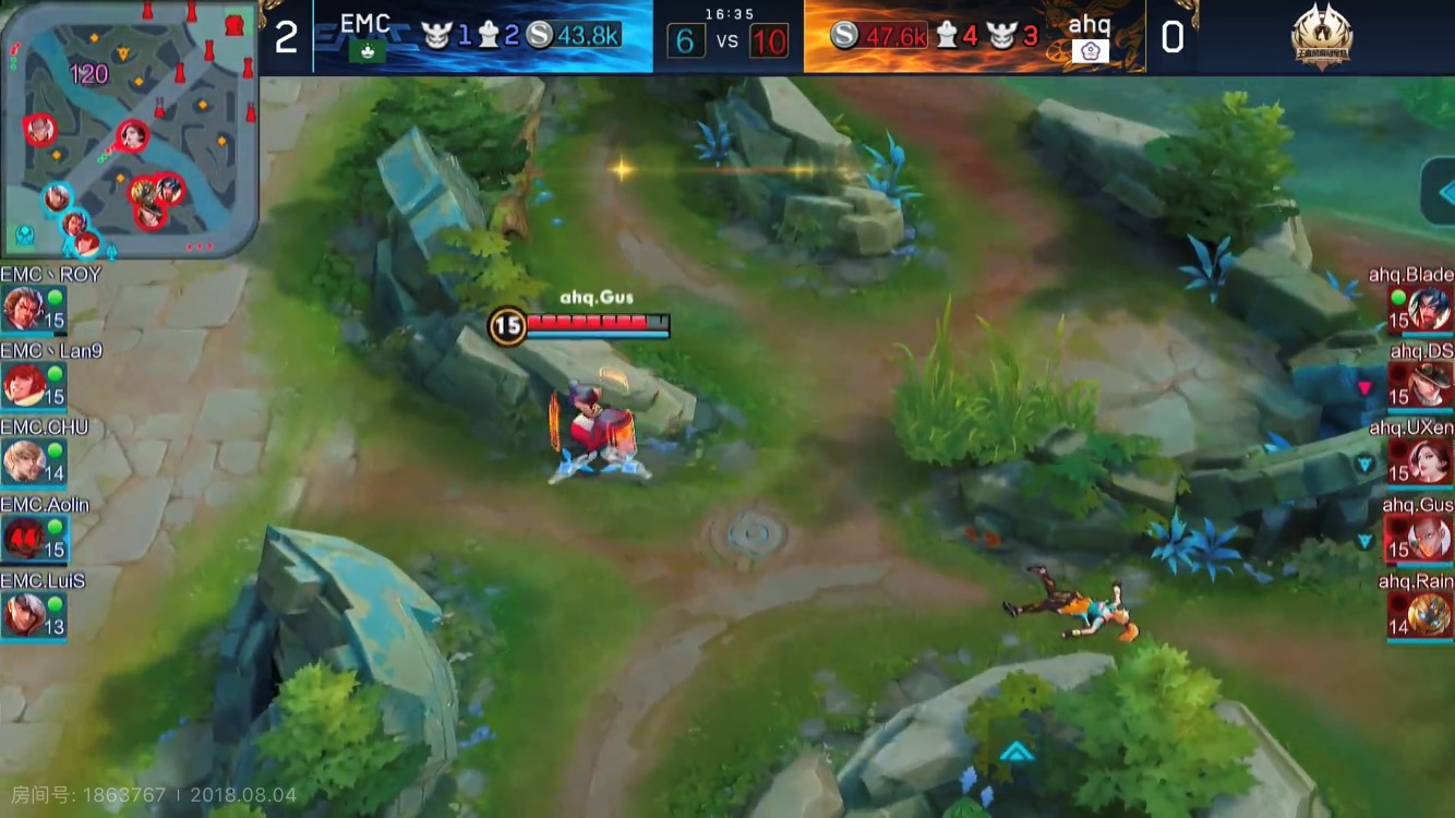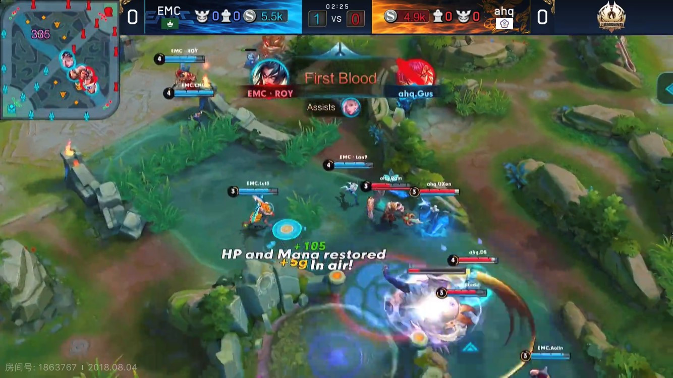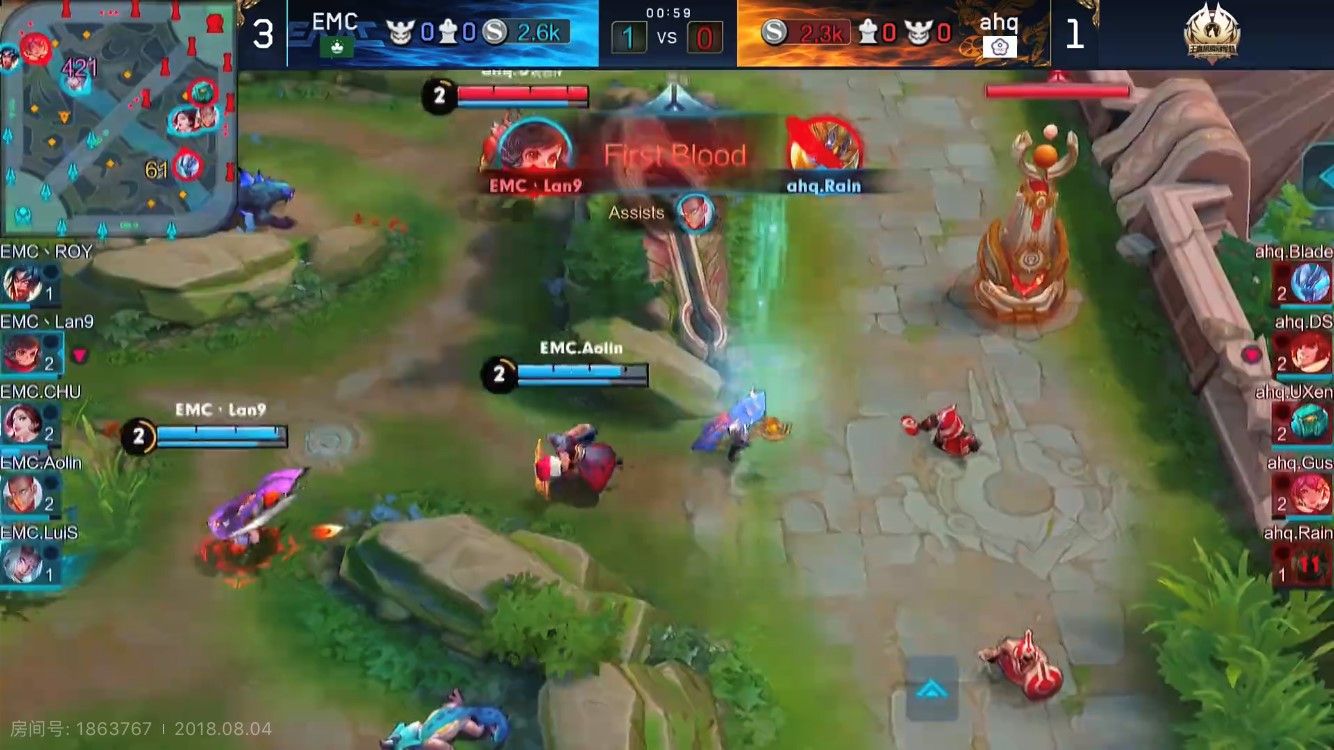 比赛开始,蓝色方EMC战队,红色方AHQ战队,EMC选择反蓝野区,项羽虽然看到但是也没有什么办法, 一波交换下来,AHQ稍微亏了一个小野怪,不过也还是可以接受!