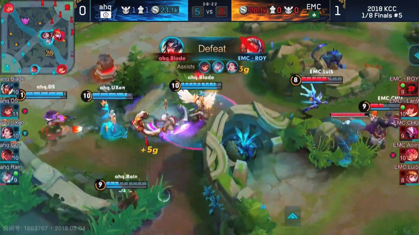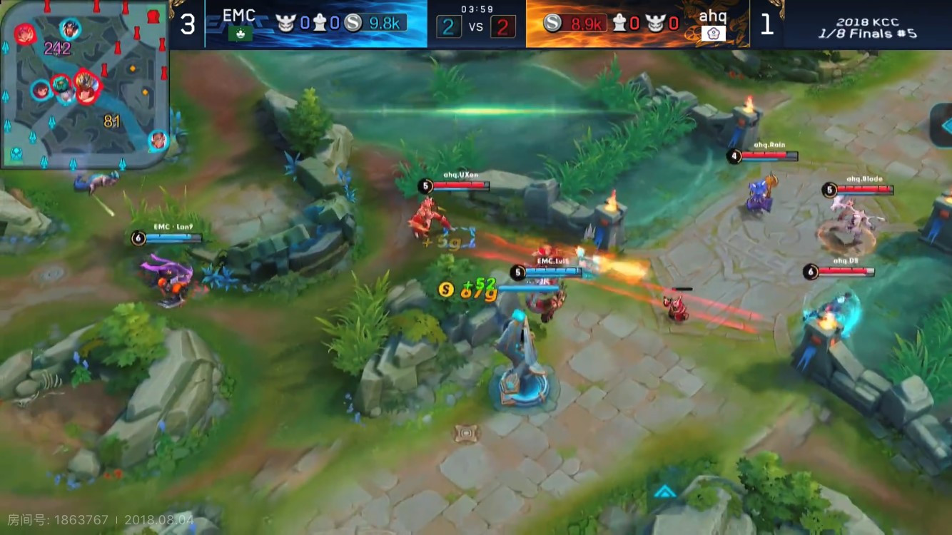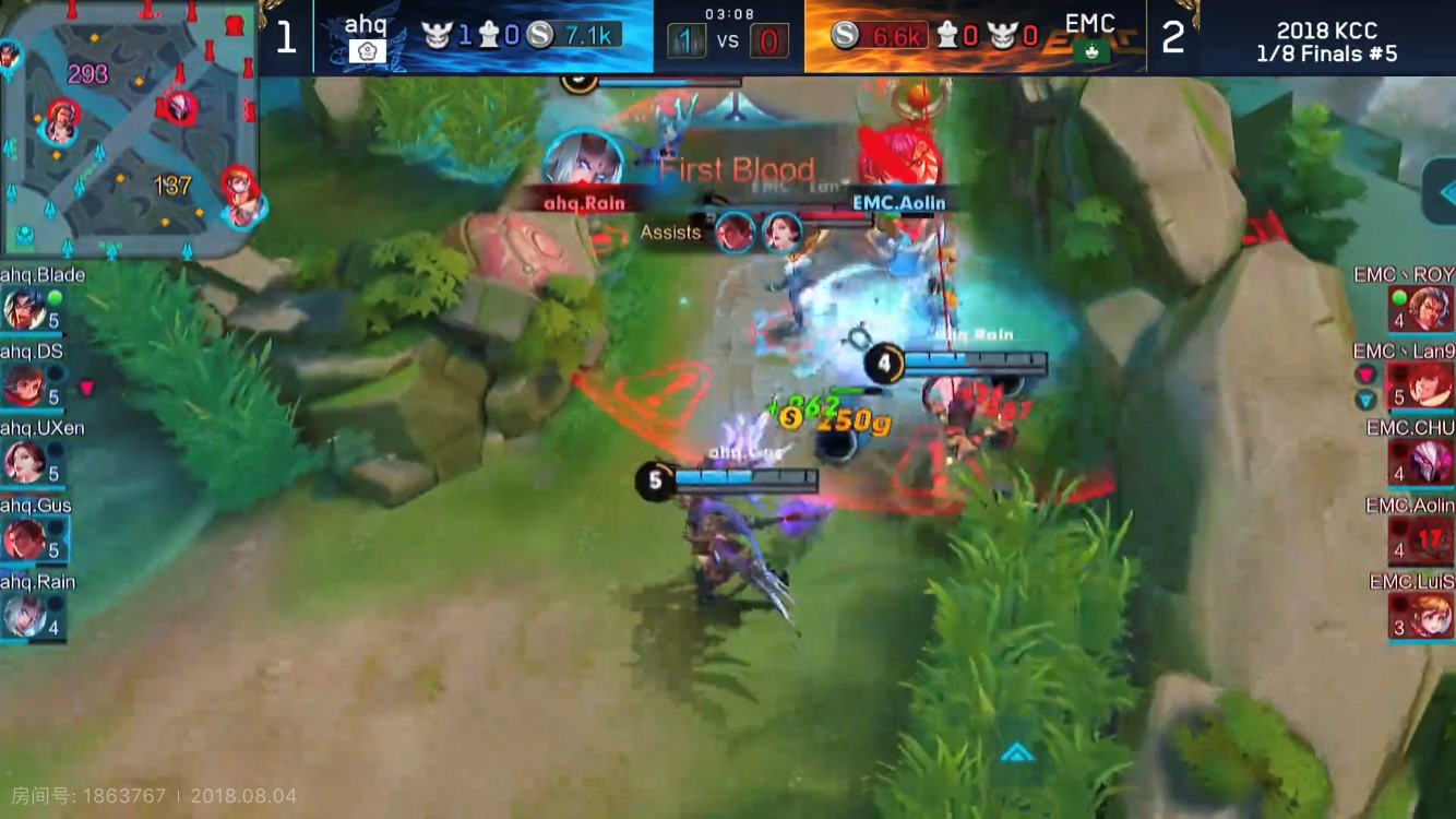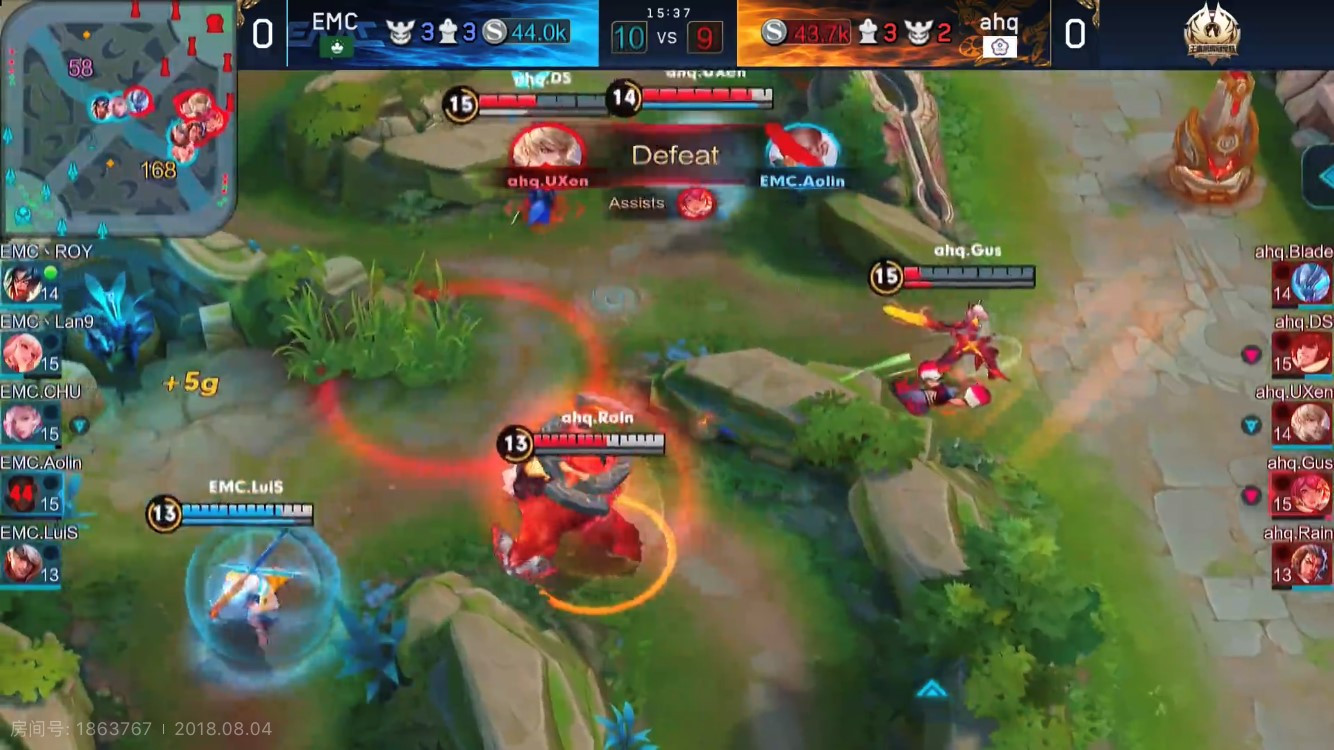 比赛进行到九分钟,AHQ鬼谷子找到机会,直接开团,EMC没有选择接团,直接卖掉队友,AHQ小赚一波!