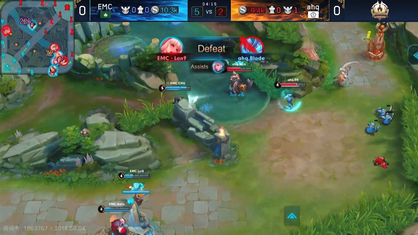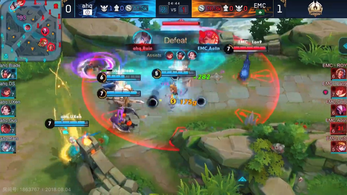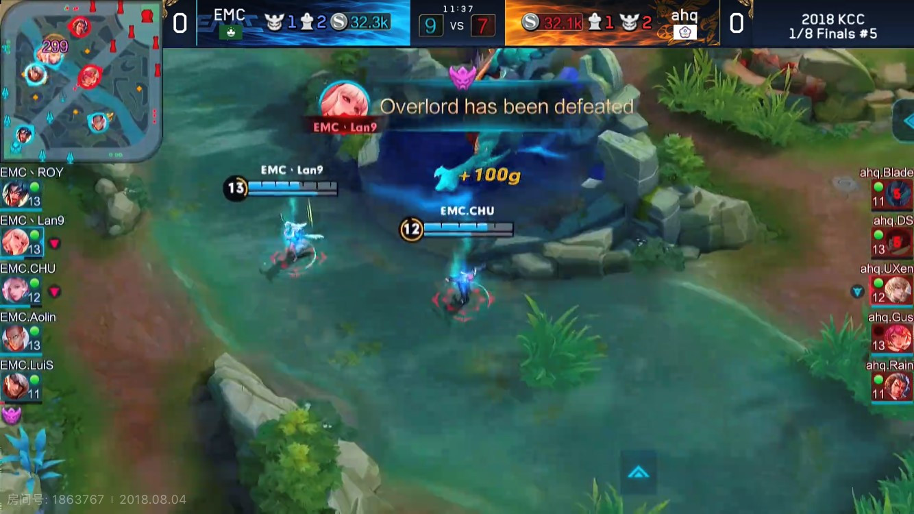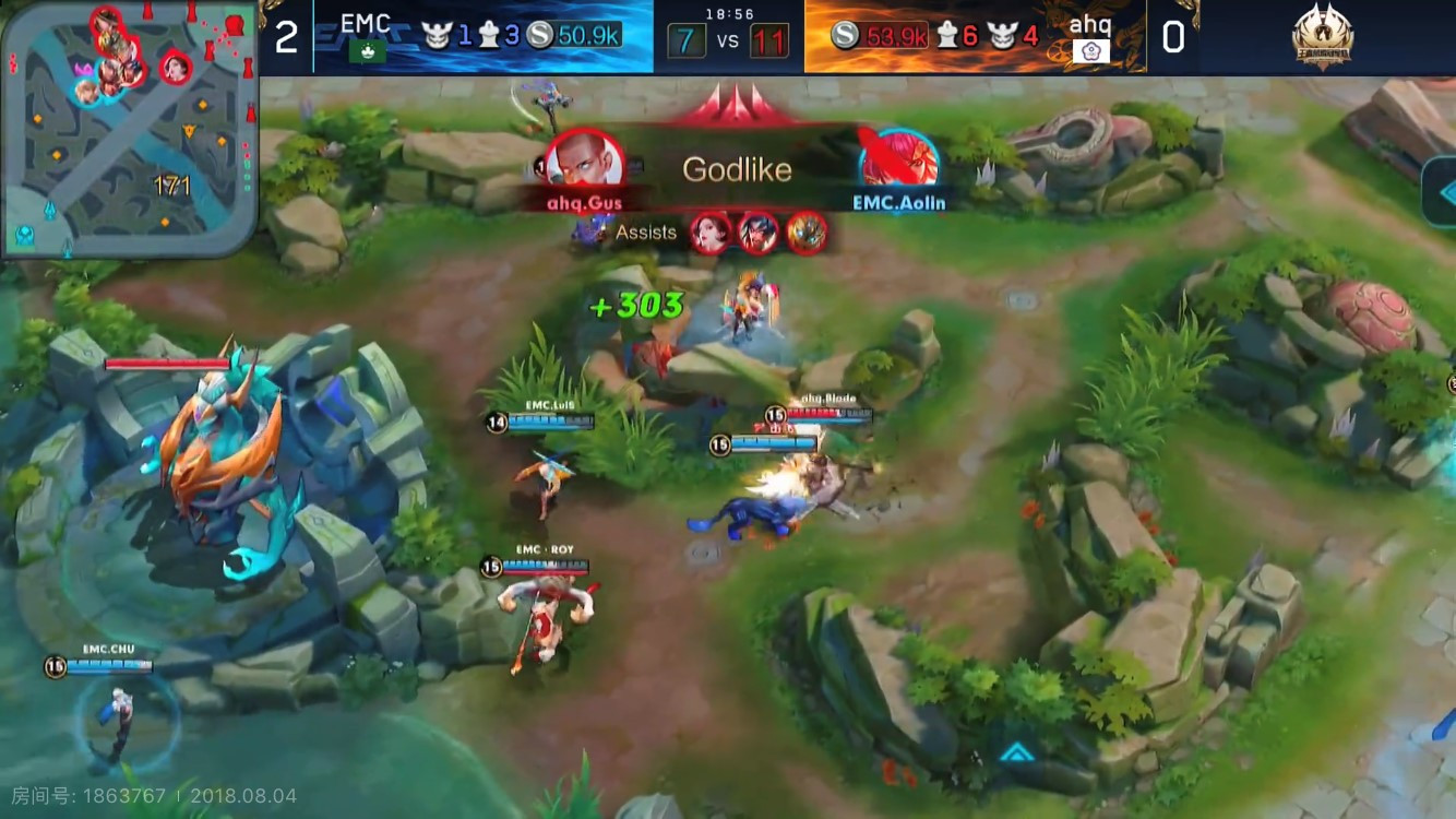 比赛进行到九分钟,AHQ鬼谷子找到机会,直接开团,EMC没有选择接团,直接卖掉队友,AHQ小赚一波!