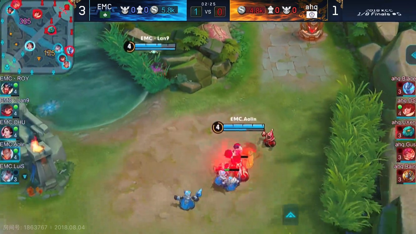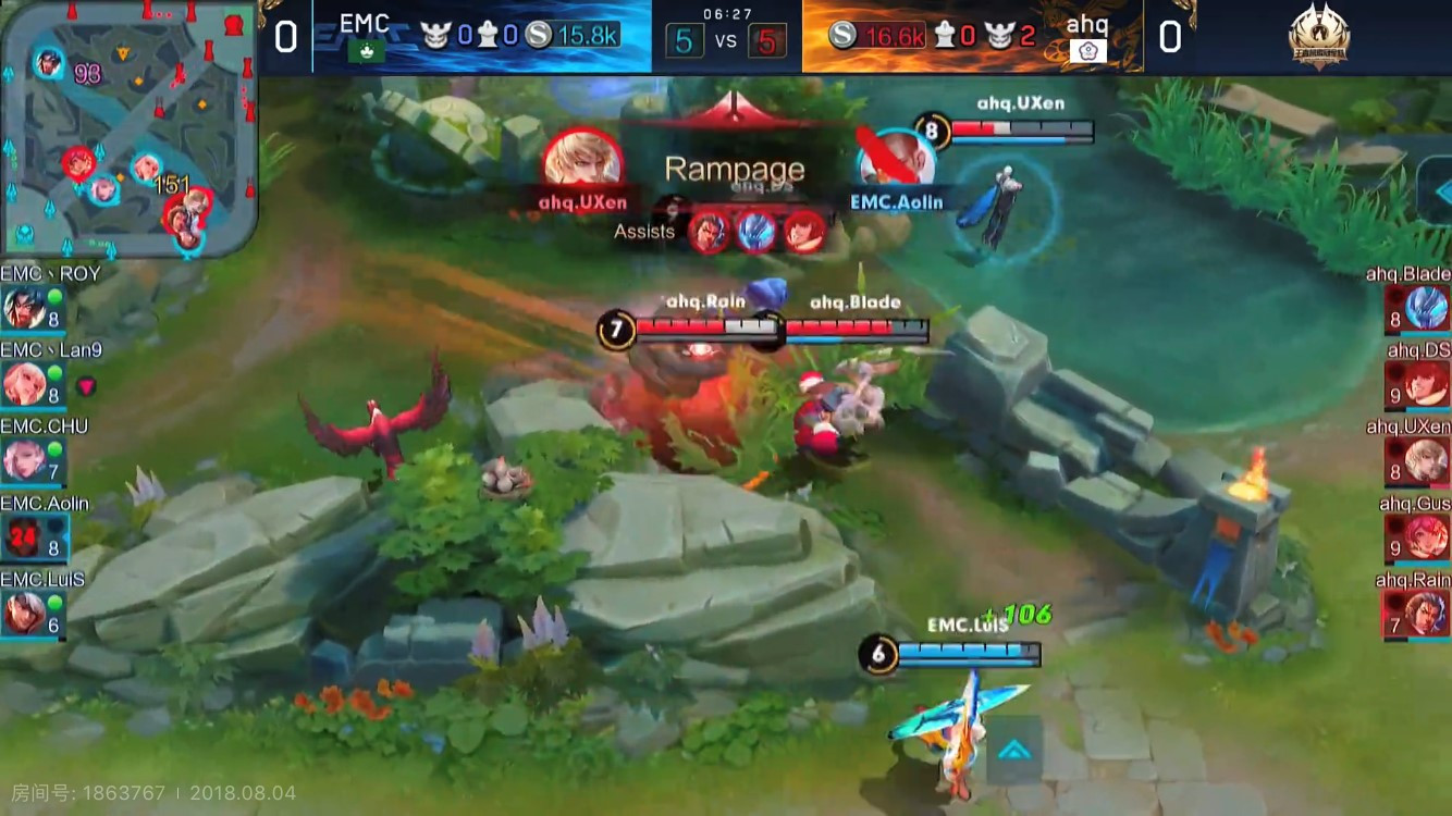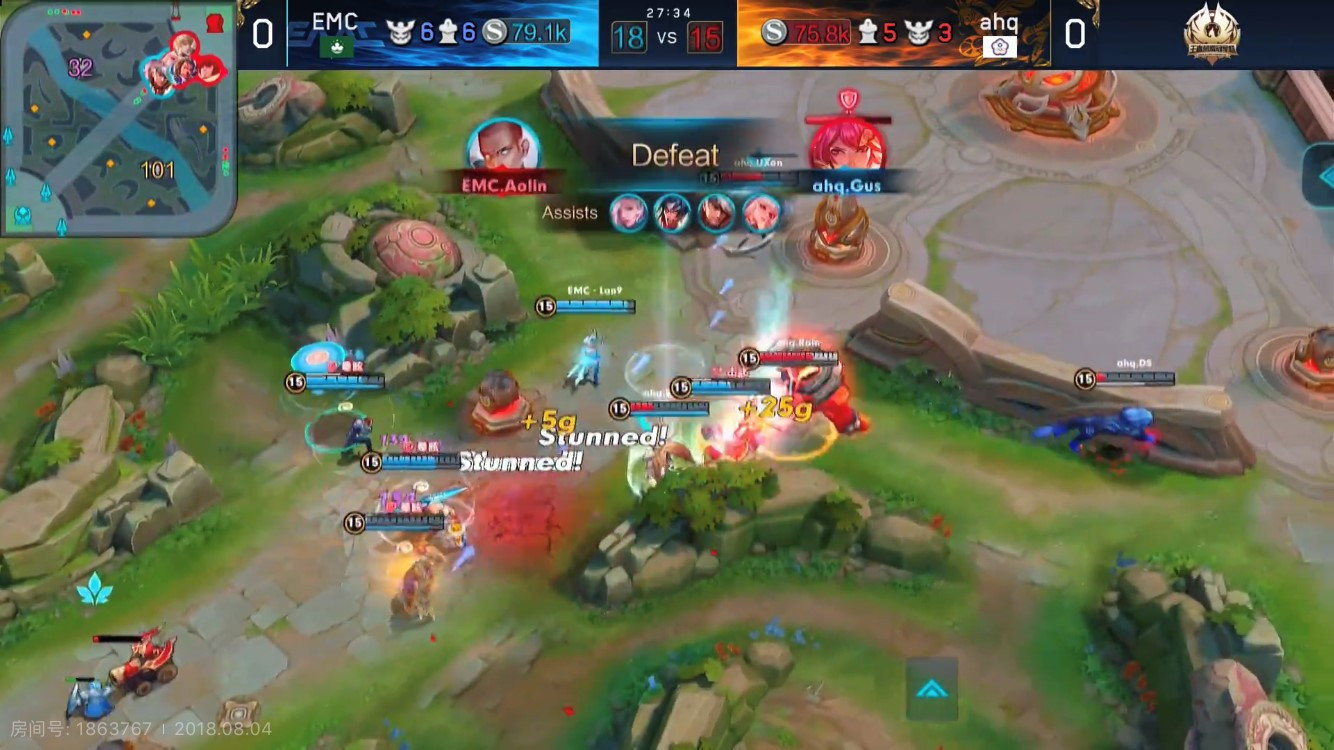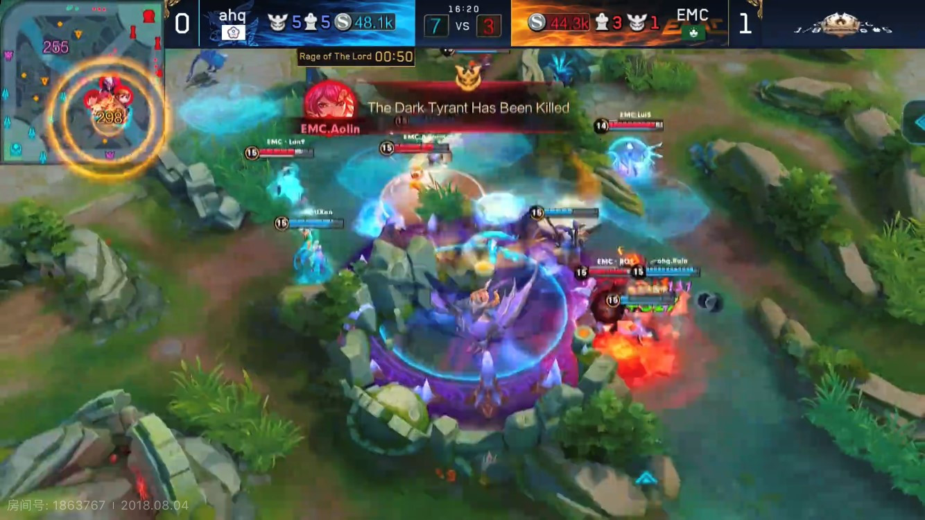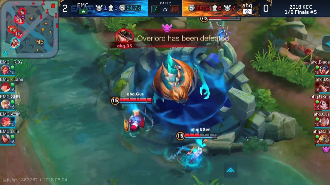 十七分钟五十秒,残血的项羽草丛回家,但是EMC众人刚好路过,项羽落荒而逃,EMC众人就地追击,天罗地网,项羽无路可逃!随后EMC想要抓住优势开主宰,但是一波追击,花木兰率先被达摩控制到,虽然有复活甲,但是也没有用,花木兰直接被击杀!此时再开主宰已经是不切实际了,只能选择撤退,AHQ也不追击,直接将主宰拿下!