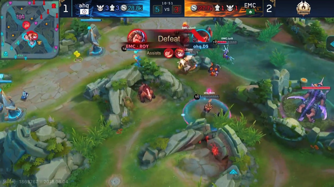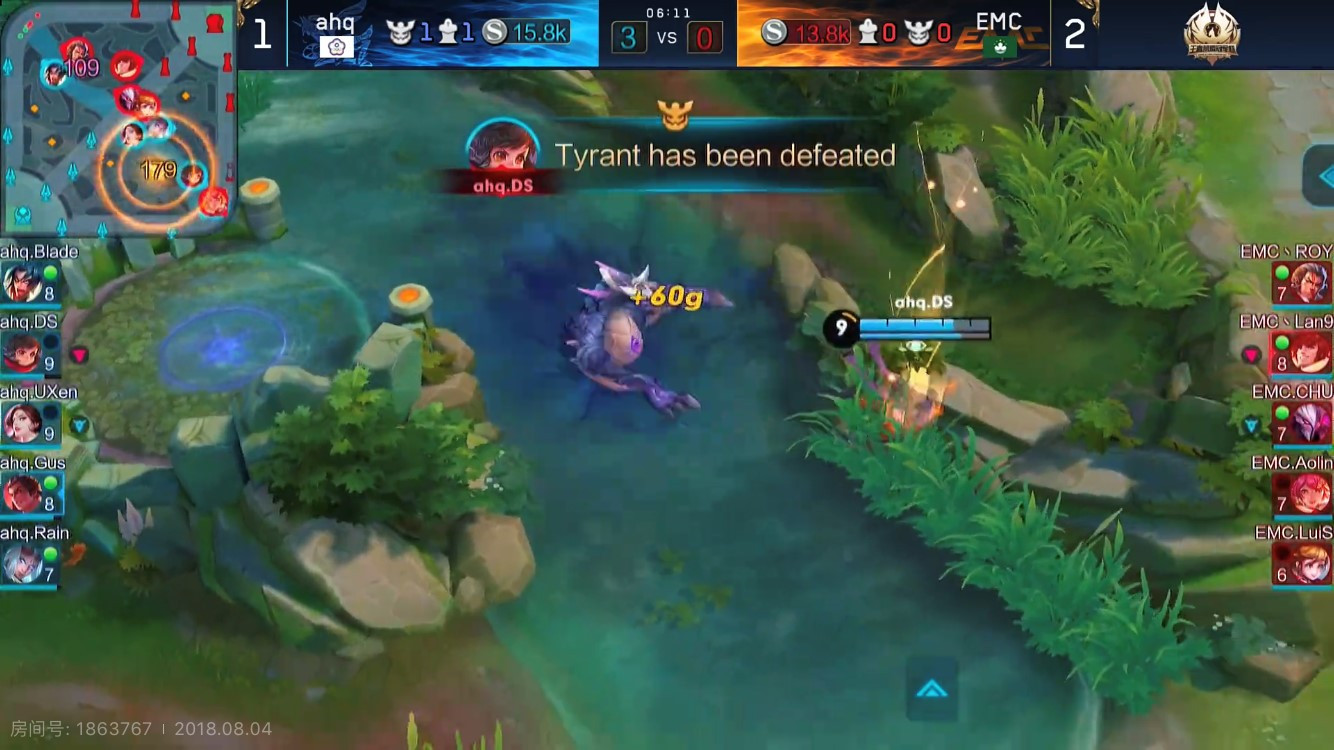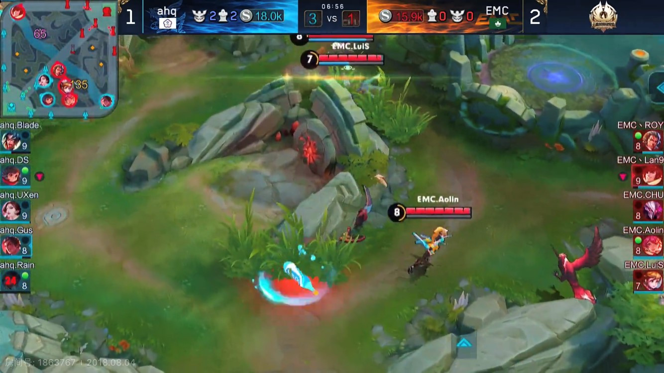 十八分钟,主宰爆发团战,AHQ率先动住在,EMC少人的氢醌啊阁下并没有选择放弃,但是裴擒虎直接将主宰收入囊中,EMC就地反打,AHQ众人的状态十分的差,一阵拉扯之下,一波1换3,MEC成功拿下团战,随后来到黑暗暴君,直接将黑暗暴君拿下!