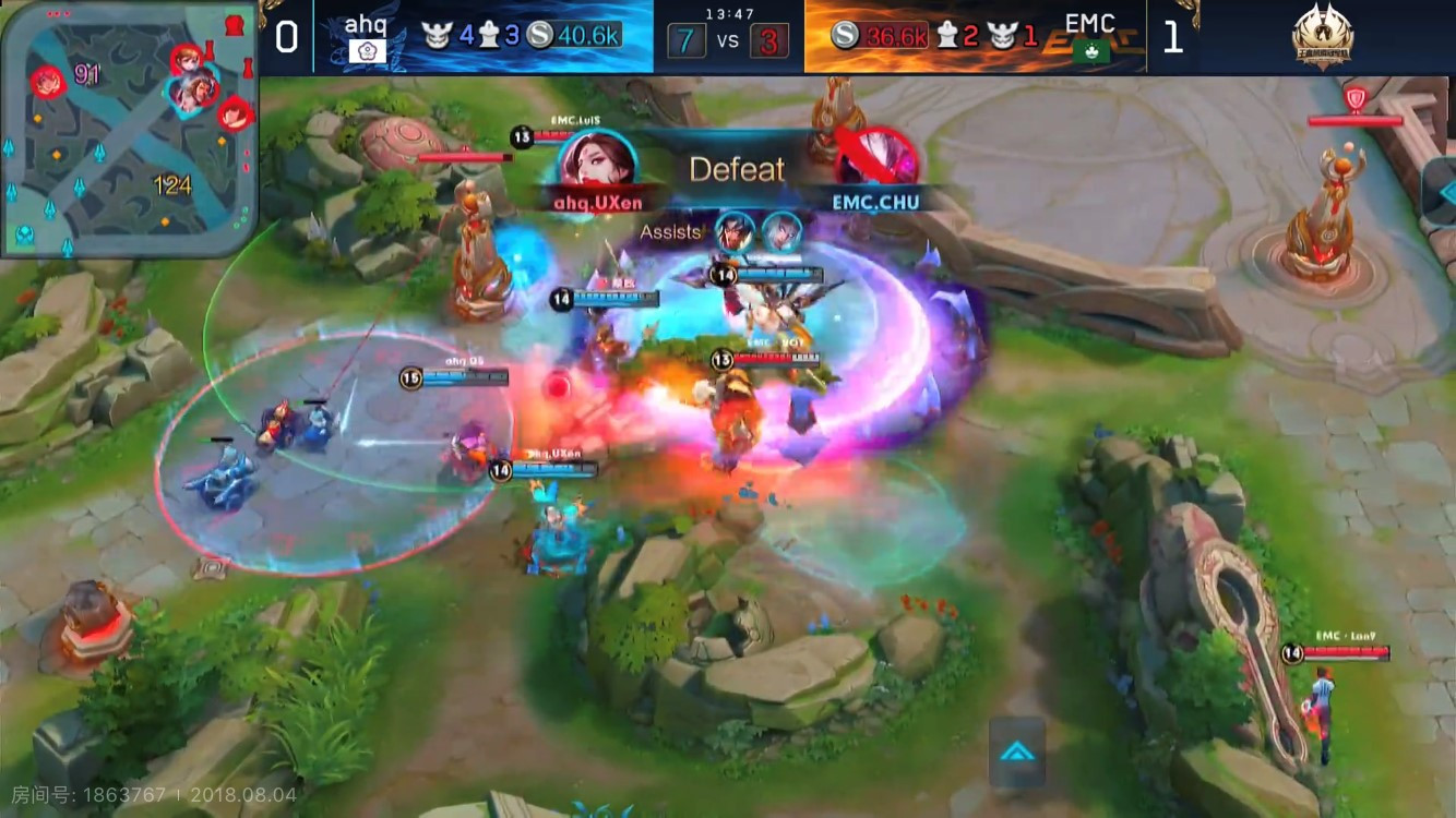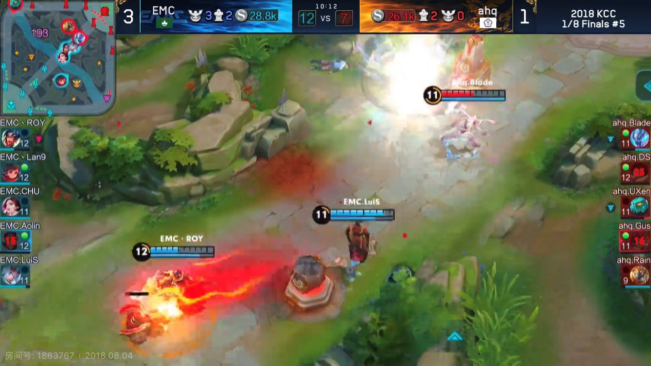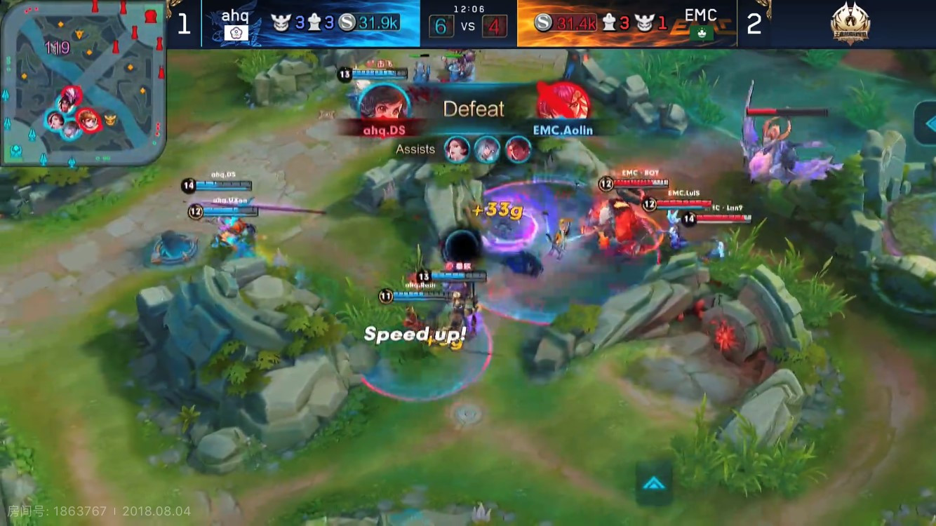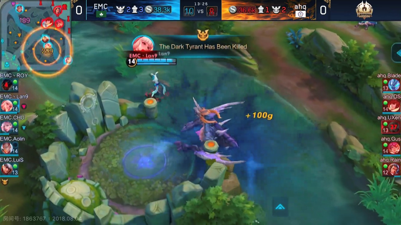 十八分钟,主宰爆发团战,AHQ率先动住在,EMC少人的氢醌啊阁下并没有选择放弃,但是裴擒虎直接将主宰收入囊中,EMC就地反打,AHQ众人的状态十分的差,一阵拉扯之下,一波1换3,MEC成功拿下团战,随后来到黑暗暴君,直接将黑暗暴君拿下!
