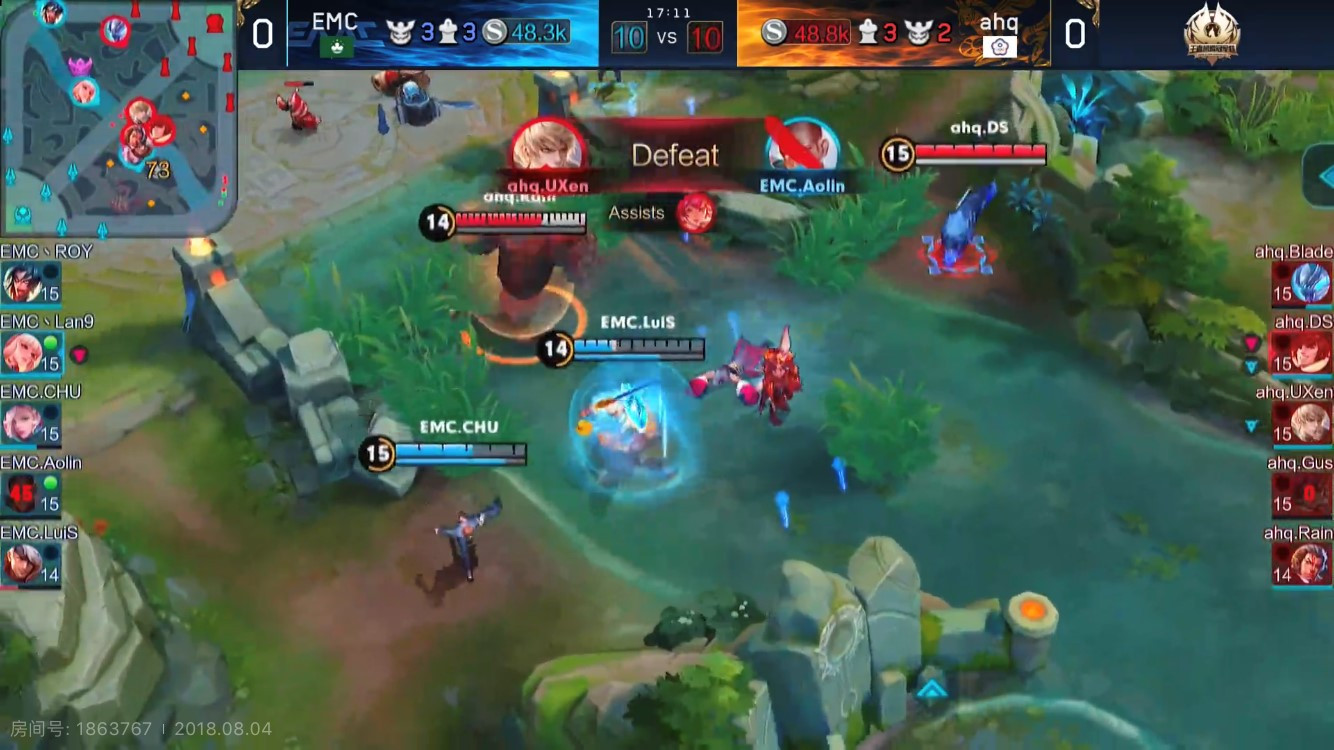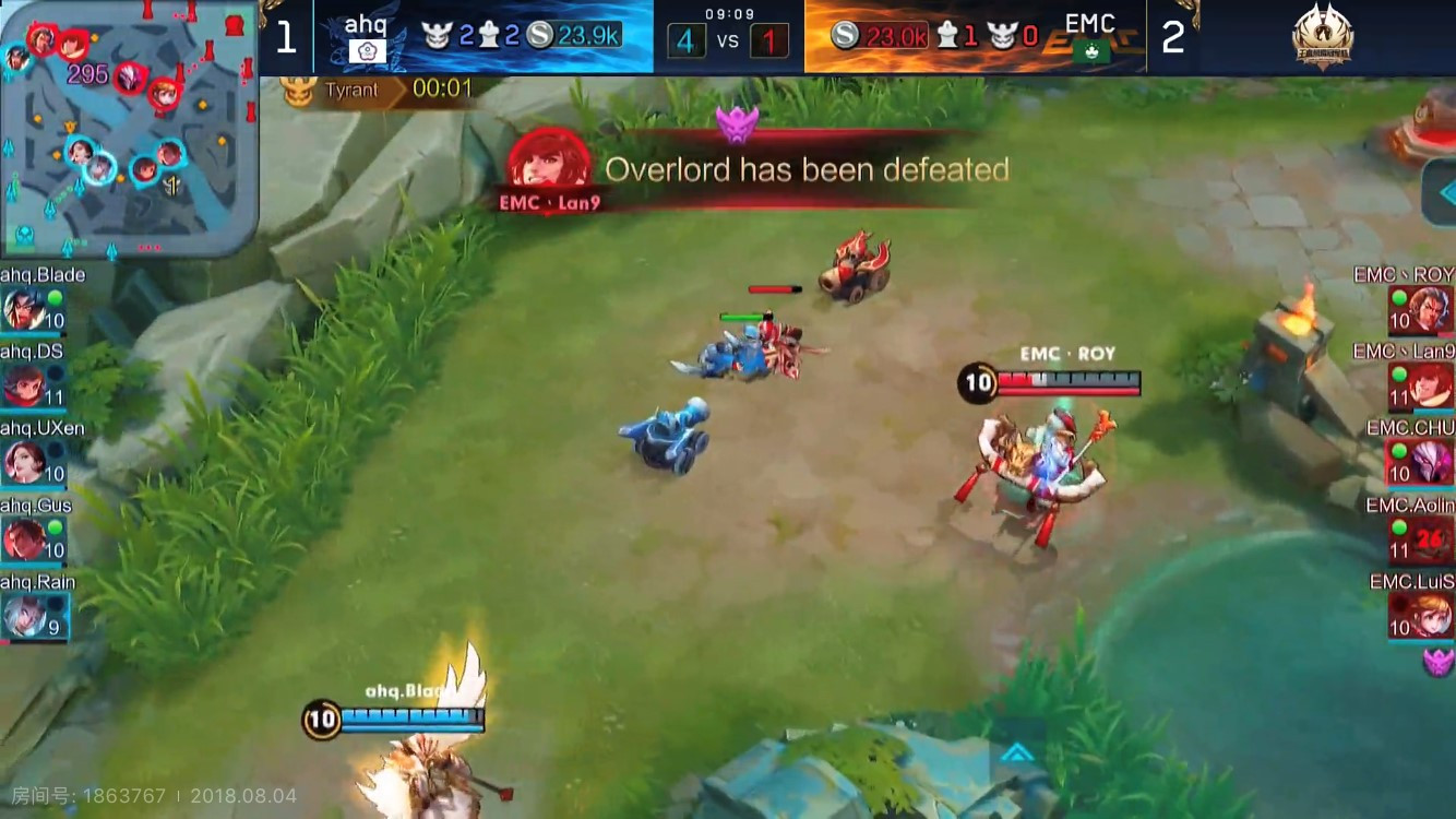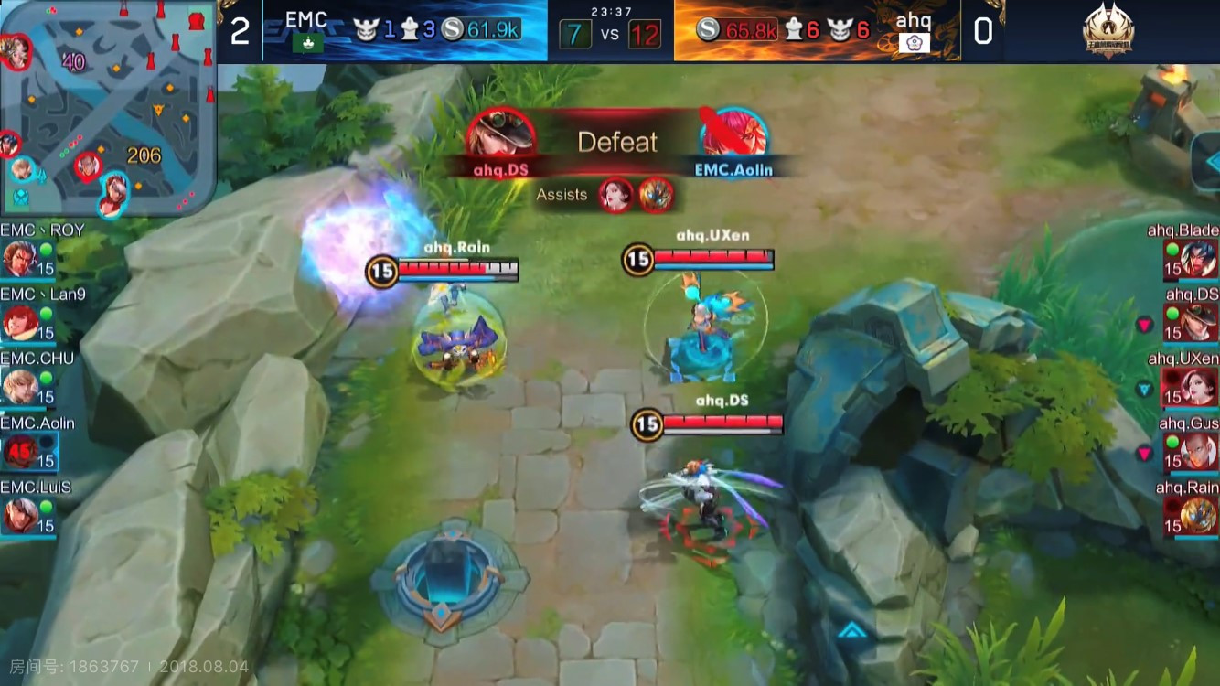 二十三分钟,EMC选择开主宰,AHQ众人姗姗来迟,确实看到主宰已经被击杀,赶紧撤退,EMC顺势乘胜追击,AHQ前排已经被包围,但是白起也是太肉了,根本打不死,最终虽然强行被杀,但是项羽也是被留下了,一波1换1,EMC选择撤退!