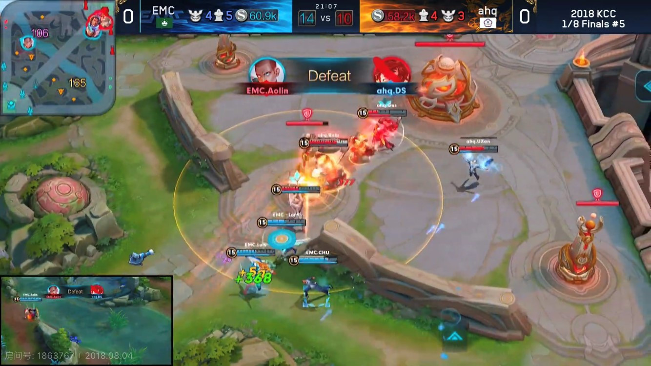 十三分钟五十秒,东皇太一率先开团,但是AHQ直接反打,率先秒掉李元芳,而AHQ的阵容已经完全被冲垮,EMC率先到下一人,但是直接开启收割模式,AHQ众人已经无路可逃,一波1换5,EMC拿下了这波团战,下路兵线已经到达,EMC直接选择一波掉AHQ战队!恭喜EMC战队!成功拿下这场比赛,成功晋级到八强当中!恭喜EMC战队!