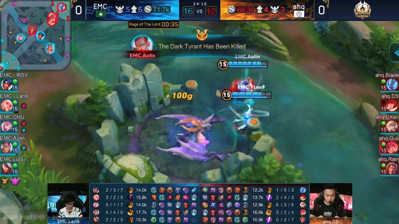 二十四分三十秒,AHQ没有机会开团,只好撤退选择开主宰,此时的EMC众人还在不断地清理兵线中,主宰直接被AHQ击杀!