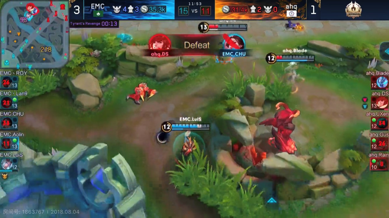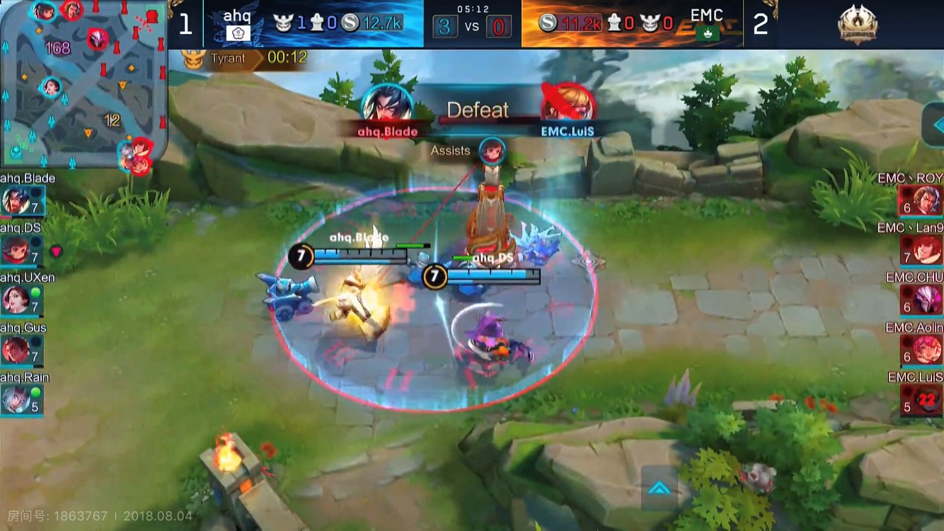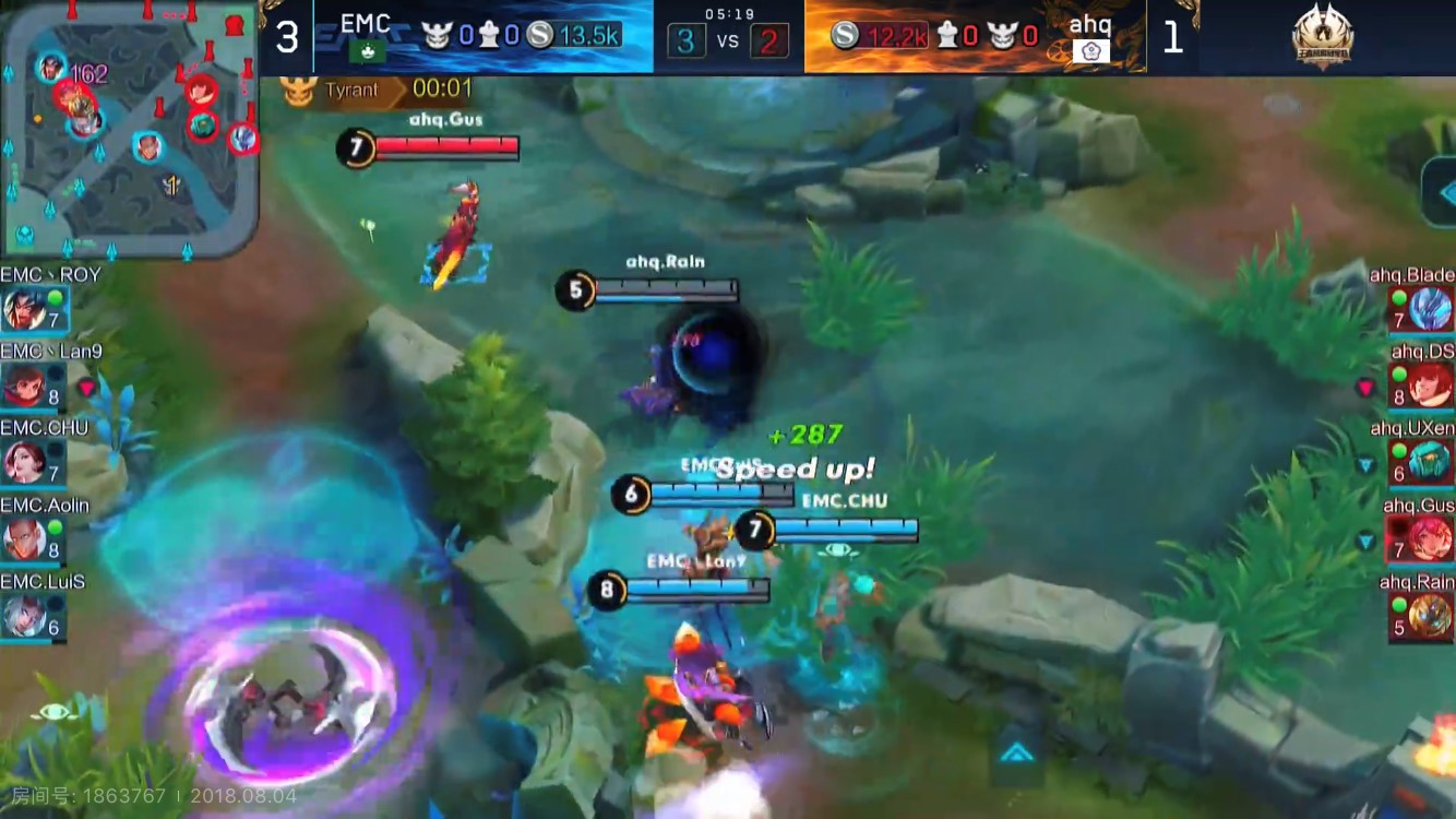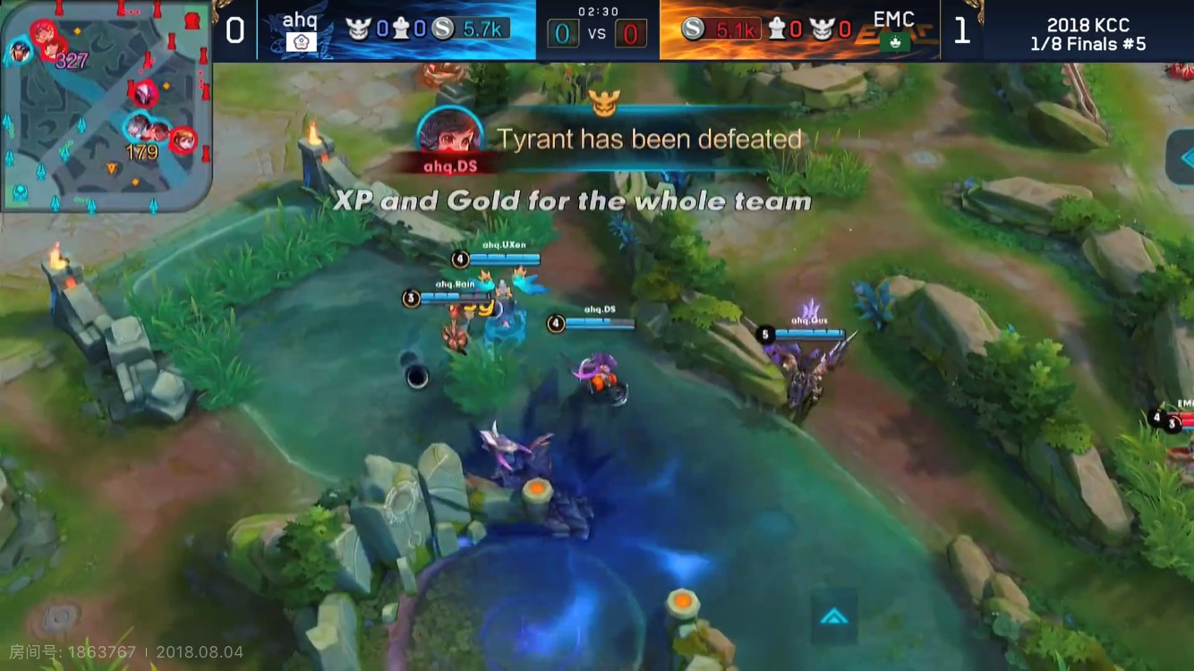 两分三十秒,EMC选择直接开暴君,鬼谷子进场,但是暴君直接被EMC收下,张飞升级到4级,直接开大,项羽和马克直接被留在暴君坑中,双双阵亡,鬼谷子还在寻找机会,但是夏侯敦直接跟上控制,鬼谷子虽然交出闪现,可是还是被击杀!蓝BUFF也是刷出,也是被裴擒虎收入囊中!一波0换3,AHQ这波很亏!