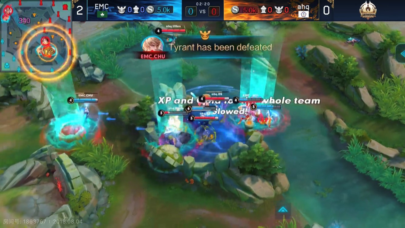 比赛开始,蓝色方AHQ,红色方EMC,双方和平开局,两分二十秒,双方暴君集合,但是花木兰从上路赶来,被元歌和达摩直接击杀在中路,AHQ这波团战已经没有办法打了,只能选择撤退,而EMC这面却是乘胜追击,直接将AHQ众人打的溃不成军,暴君也是却是被张飞拿下!
