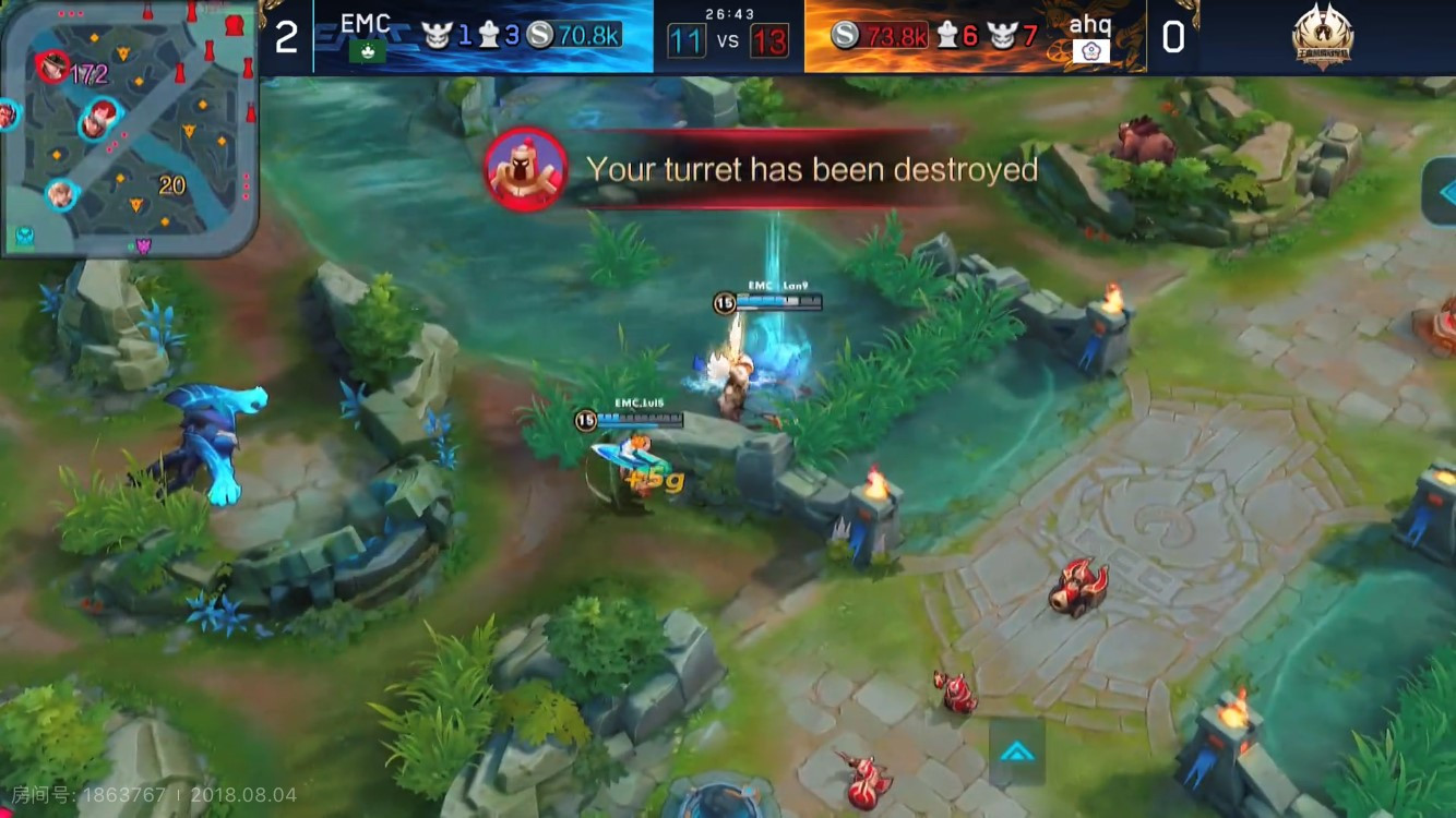 六分二十秒,上路EMC上野配合直接将上路一塔拿下,AHQ也是没有闲着,交换资源,也是将暴君收下!